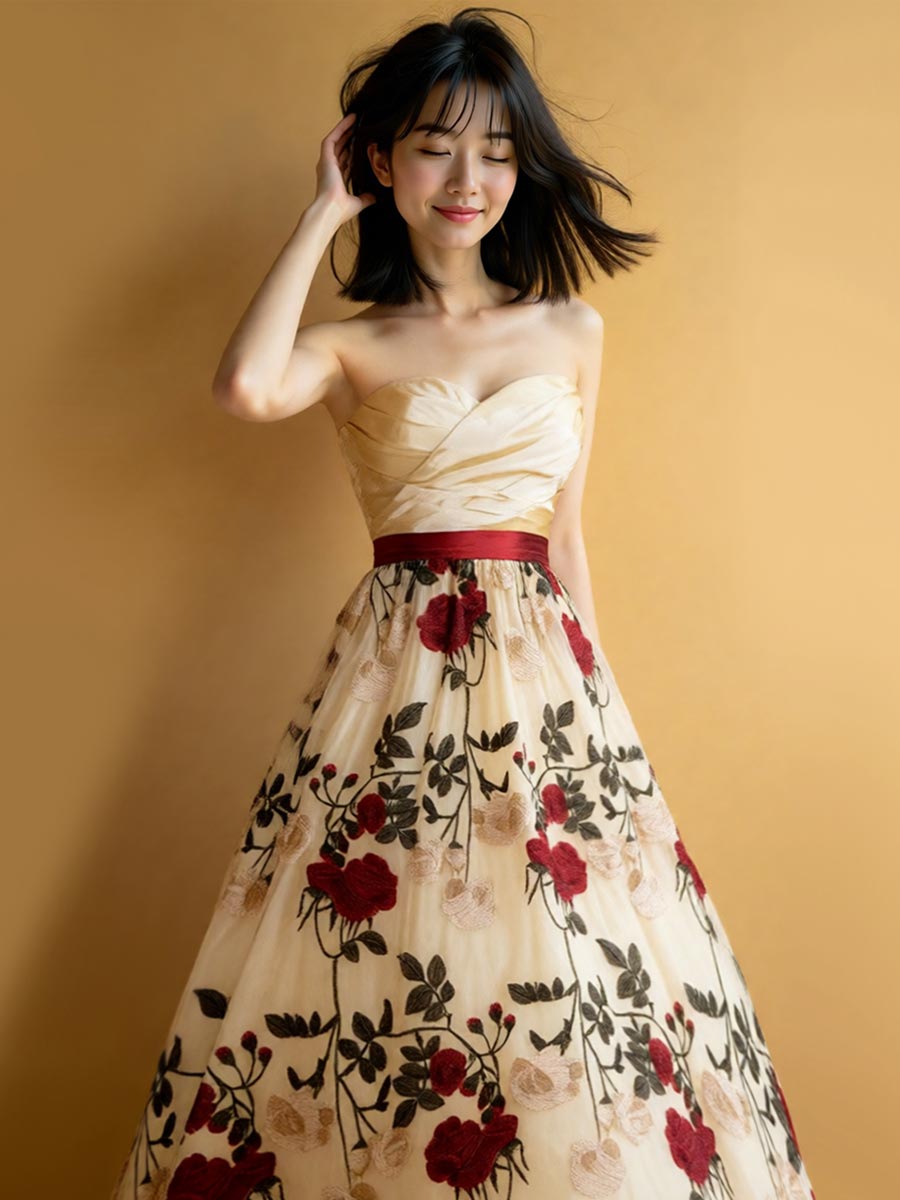 ベージュベースに少し深みのあるワインレッドの刺繍を使うことでナチュラルさと優しい印象を与えてくれます。大ぶりなバラの刺繍をスカート部分全体に使っているのでナチュラルさの中にもしっかりとインパクトのあるドレスになっています。