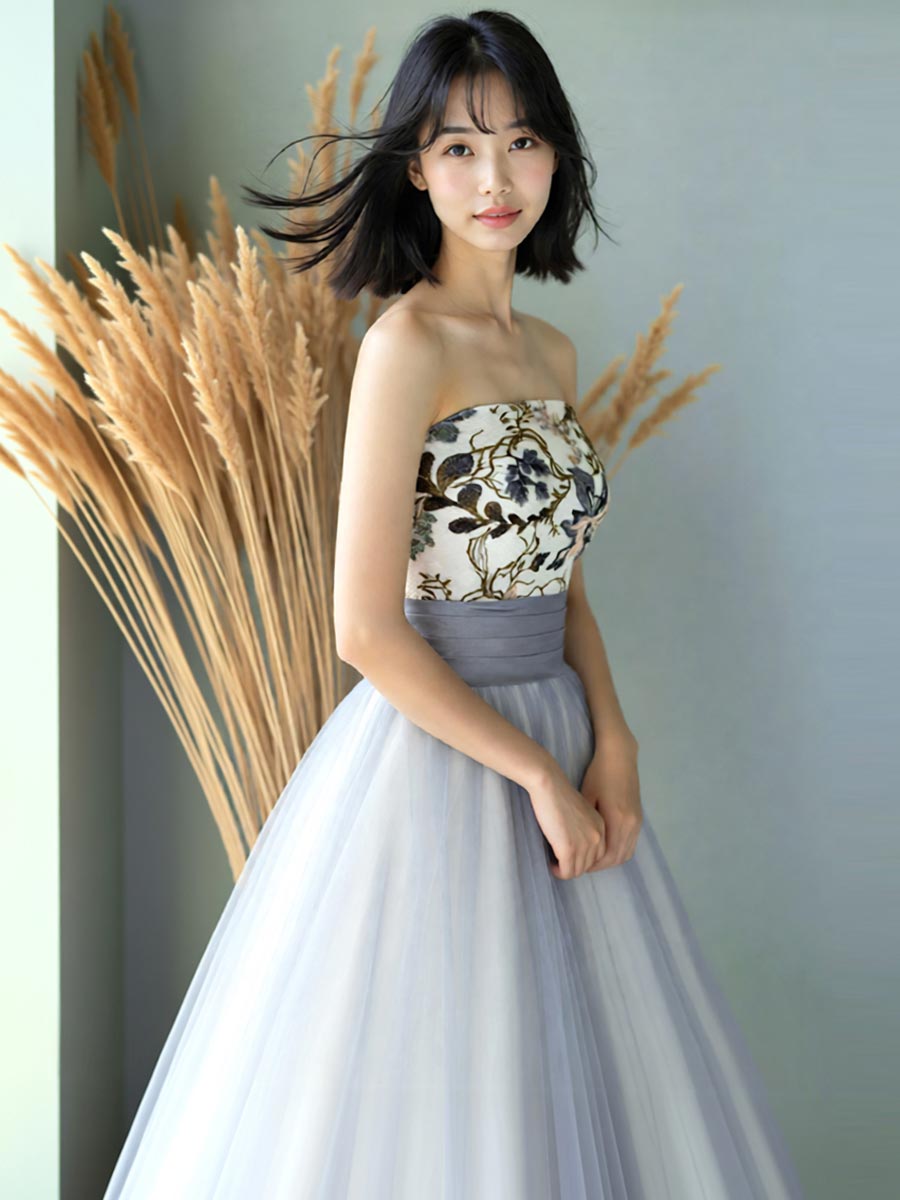 アイスブルーのチュール×オーガンジーが透明感のあるお花刺繍入り演奏会ドレス