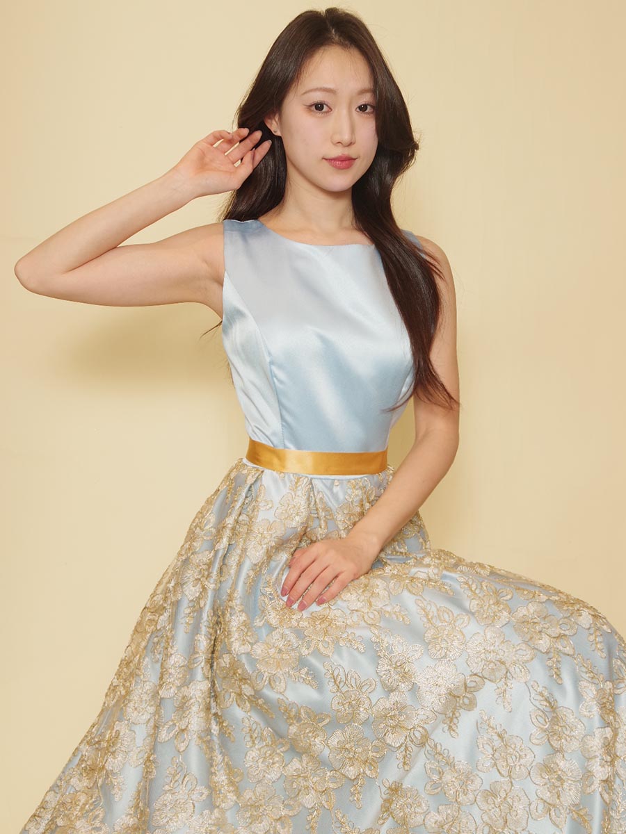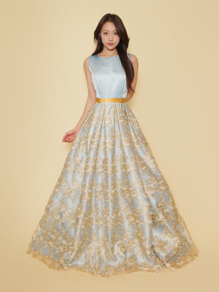 ゴールドのフラワー刺繍とパステルブルーの爽やかな色合いを組み合わせた高級感と可愛らしさのあるステージ肩袖デザインドレス