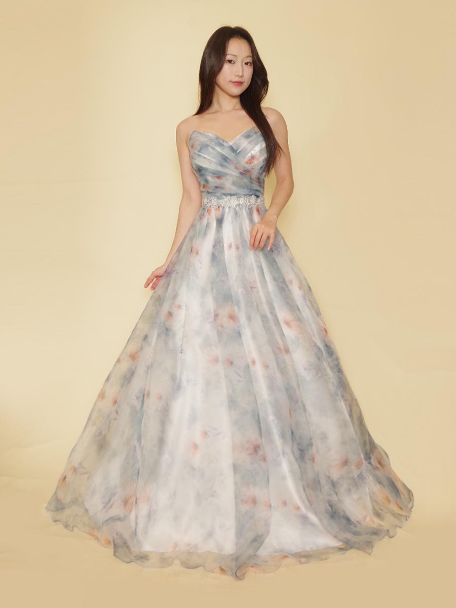 スモーキーブルーカラーが大人っぽい可愛らしさを演出した花柄ボリュームステージドレス