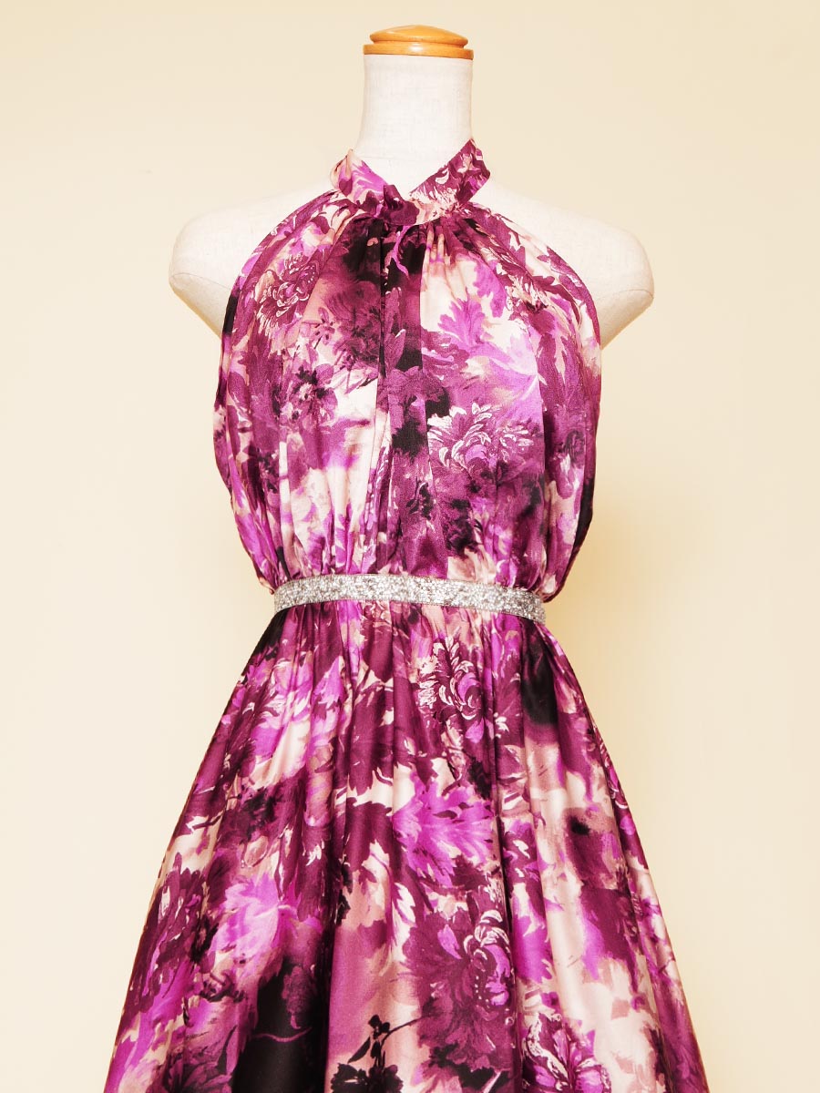 深みのあるパープルカラーの花柄プリントホルターネックドレス