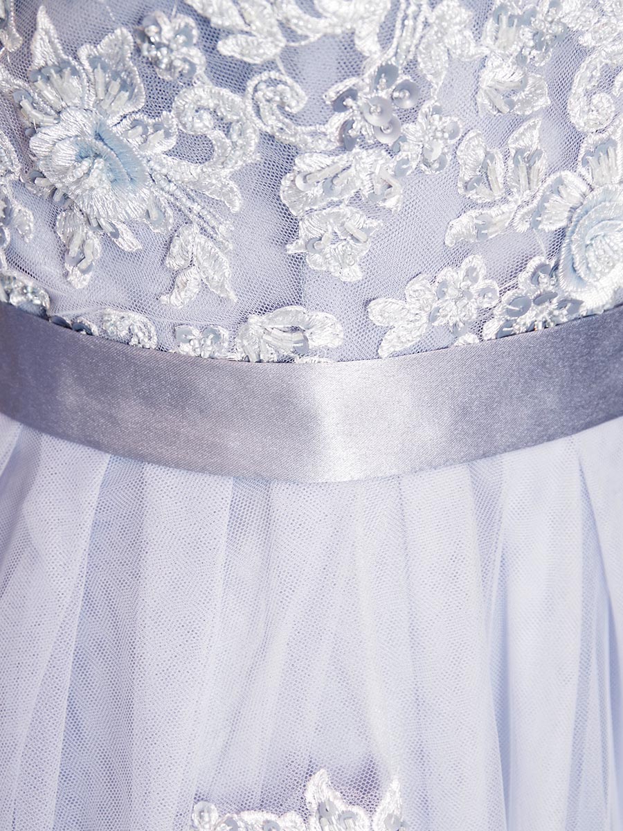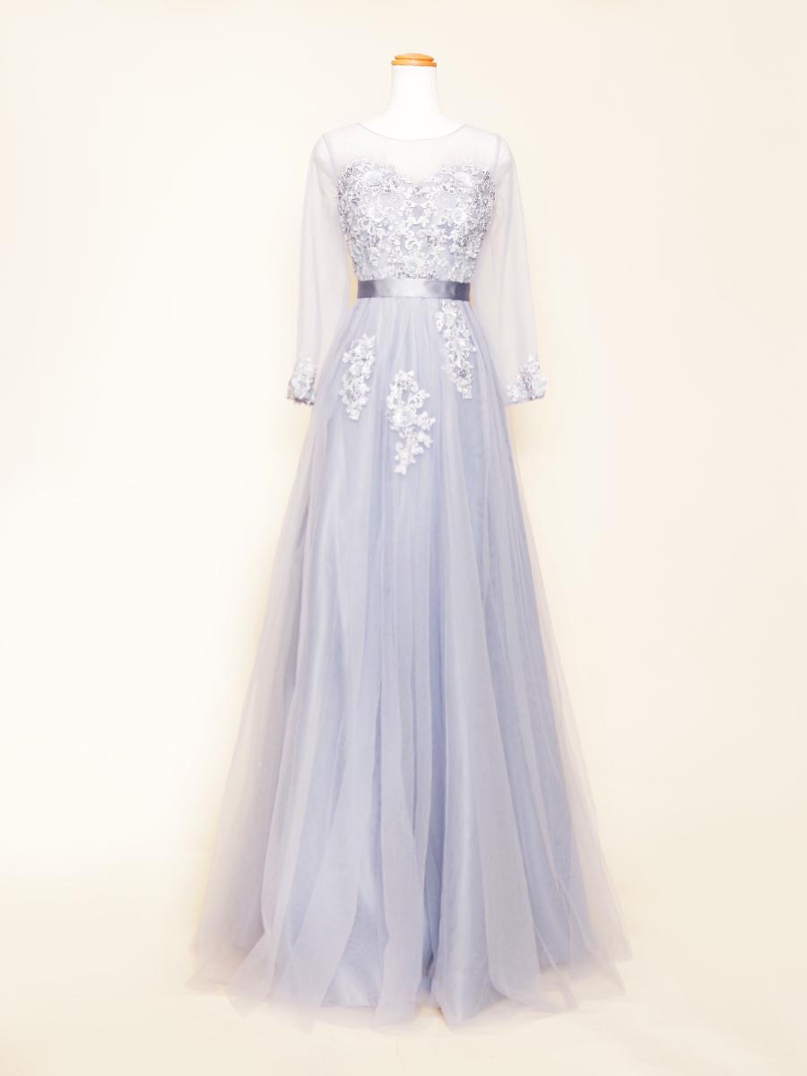 スモーキーパステルブルーの長袖デザインのふんわりスカートボリュームの演奏会ロングドレス