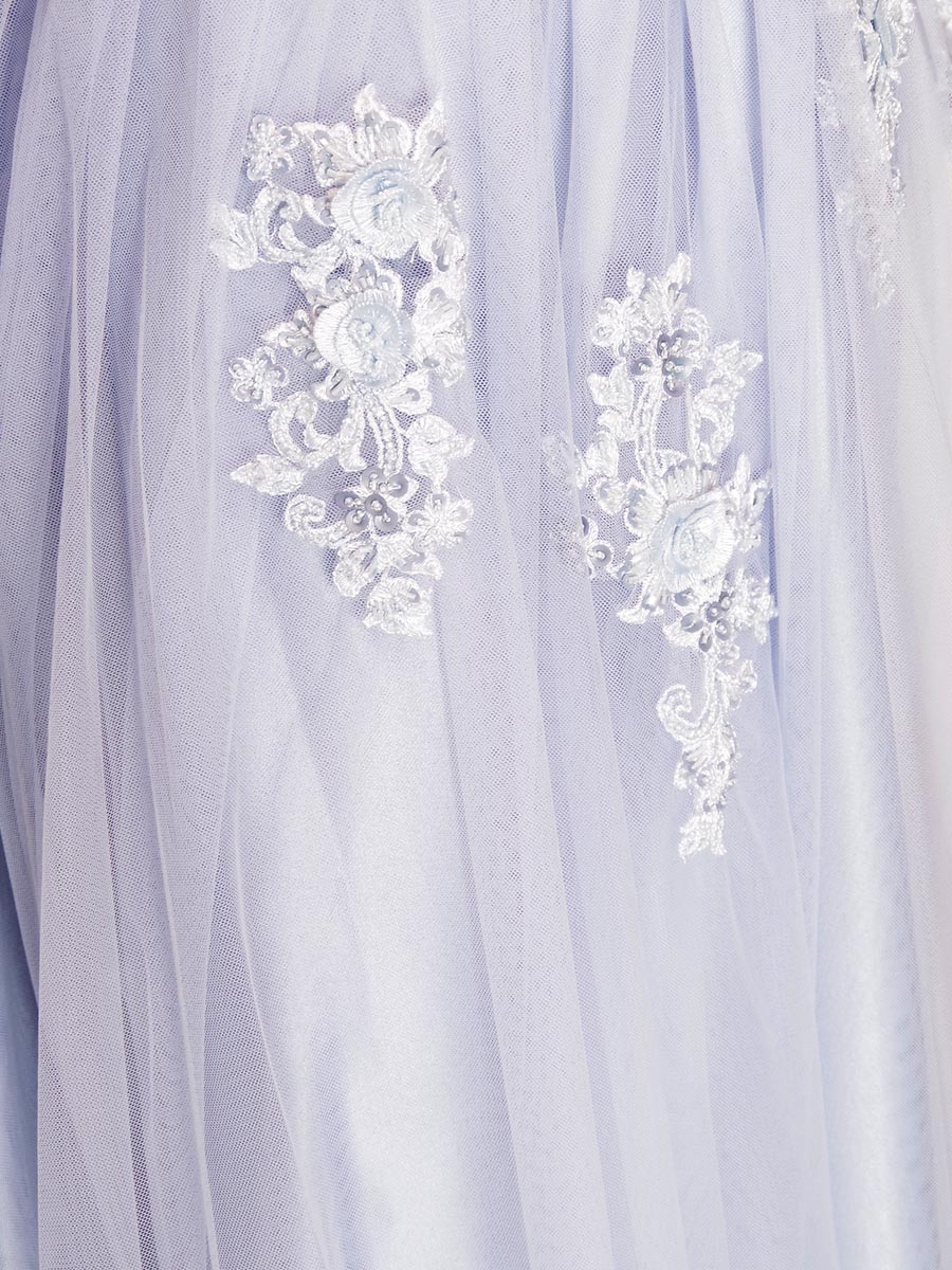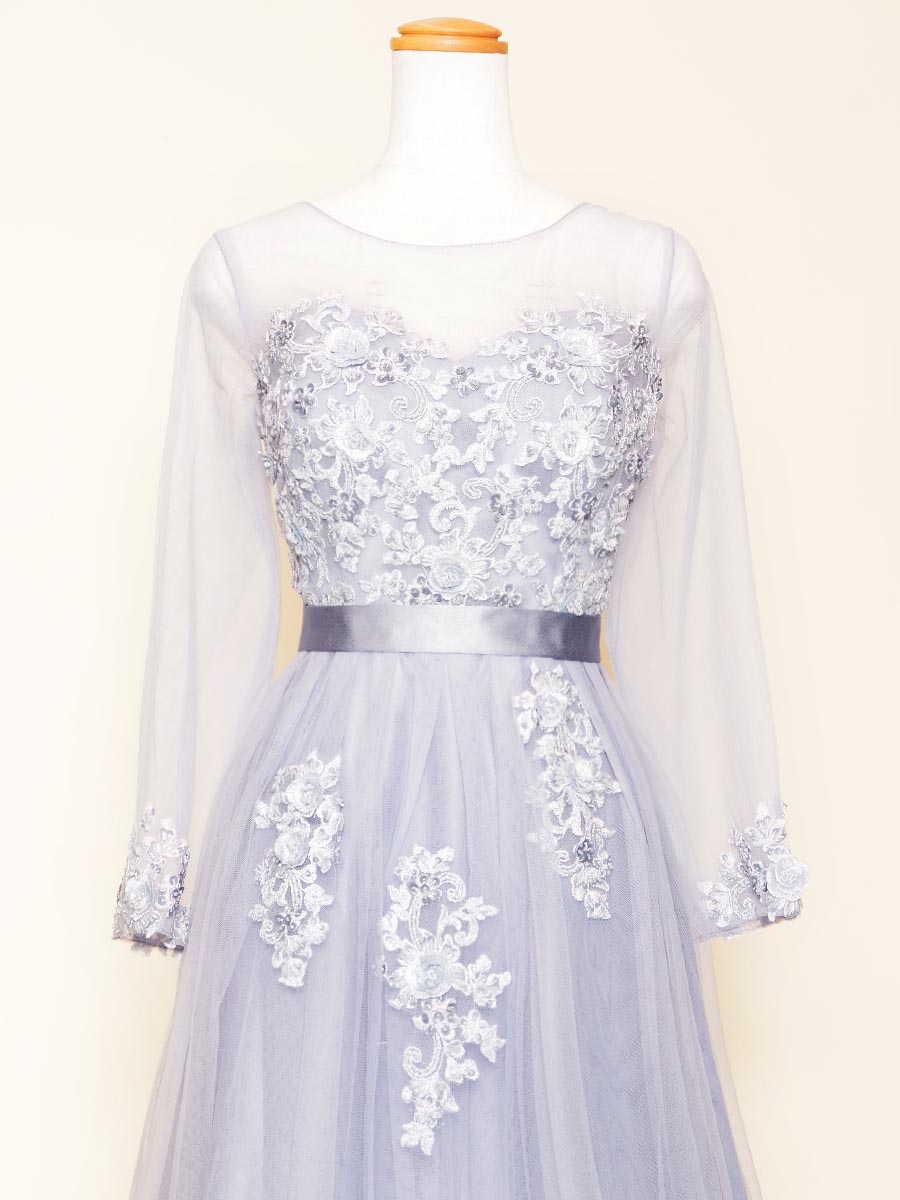 優しい風合いのスモーキーパステルブルーカラーが可愛らしさを演出した長袖デザインの演奏会ボリュームロングドレス