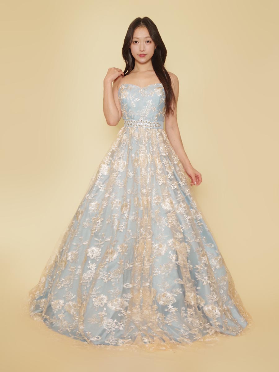 クラシカルな雰囲気とパステルスカイブルーのキュートな印象を程よくミックスさせてボリューム感あるカラードレス。