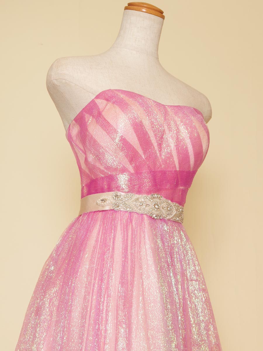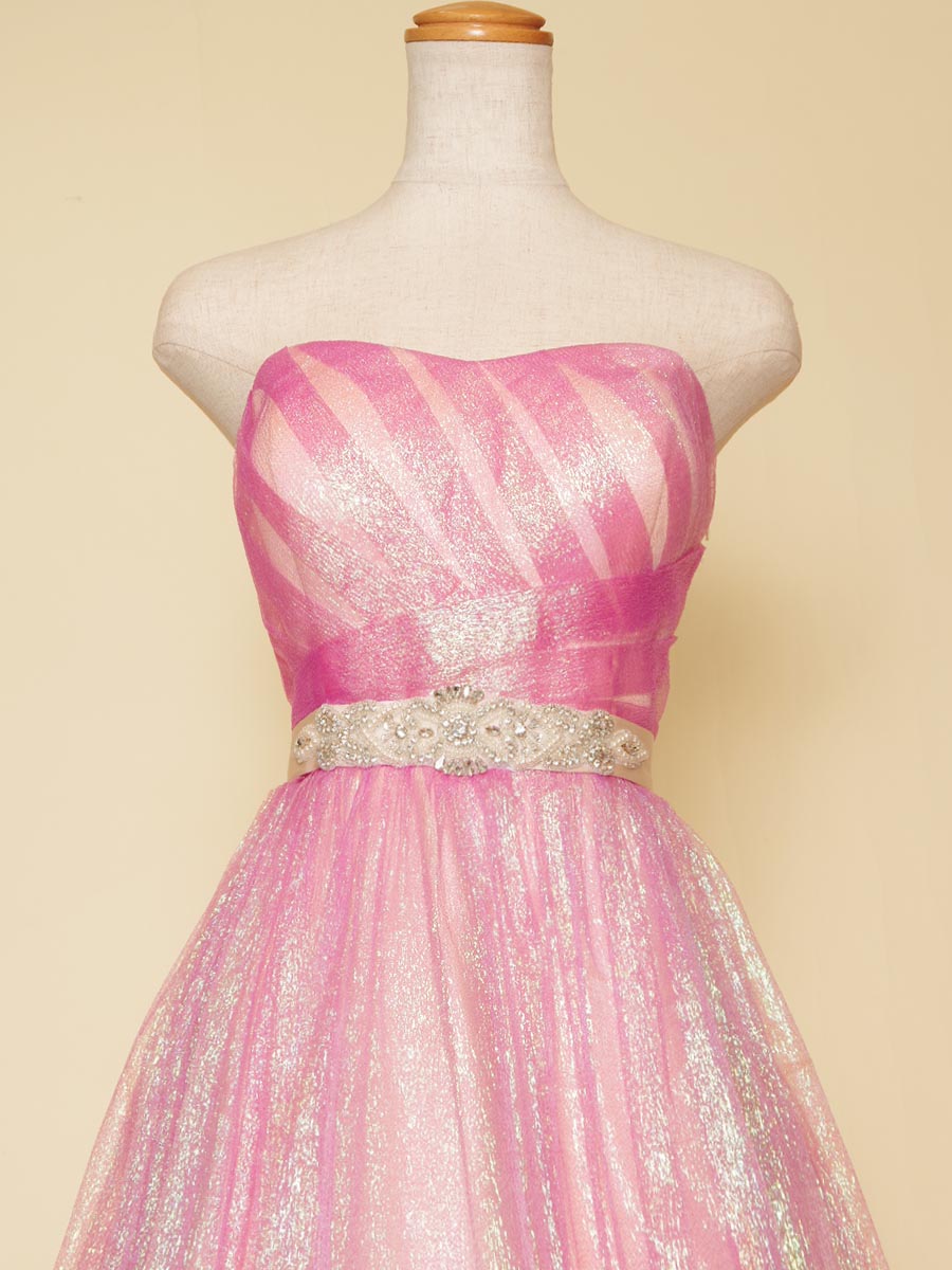 キャンディーのような見た目にも甘い印象を感じさせてくれるピンクカラーのコンサートボリュームドレス。