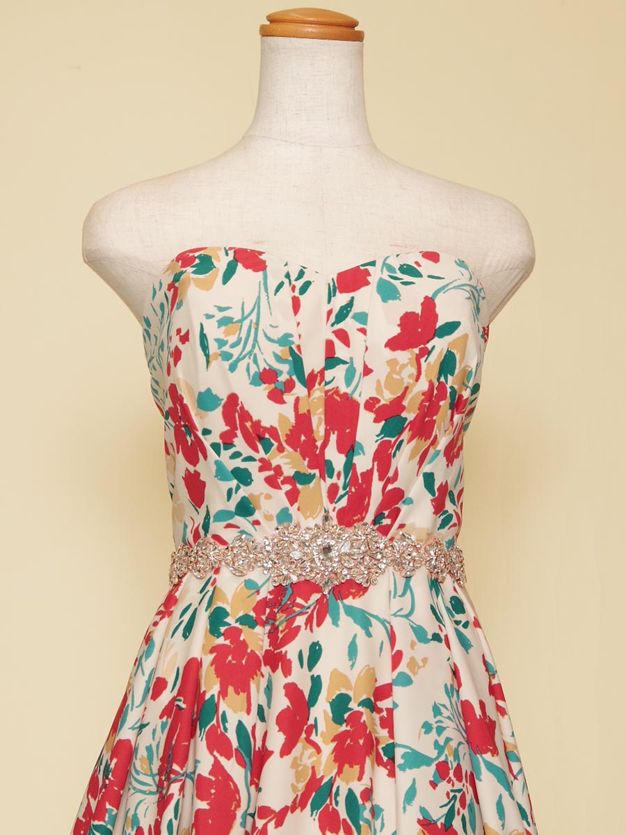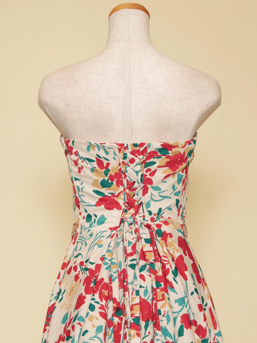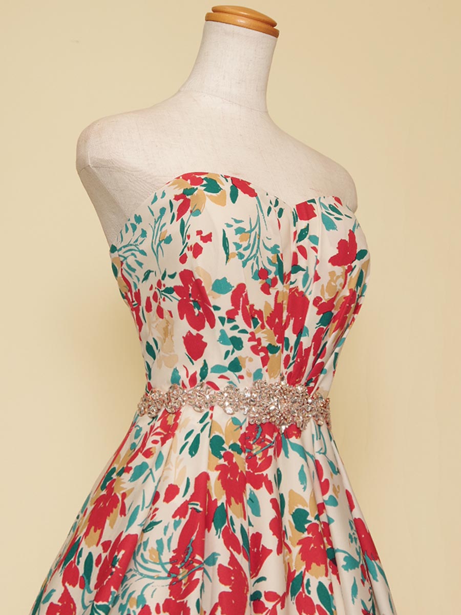 まるで絵具のような風合いでデザインされた花柄模様のAラインシルエットのステージドレス。