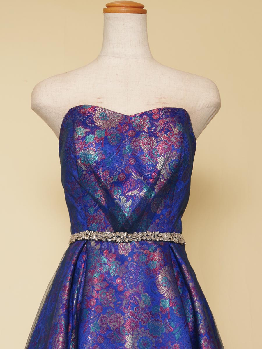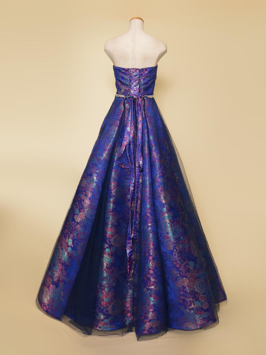 深みのある美しさを表現したブルーの光沢感を持たせたジャガード生地のコンサートボリュームドレス。