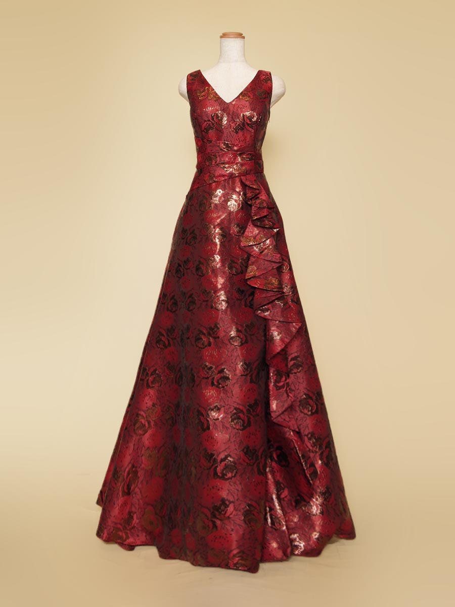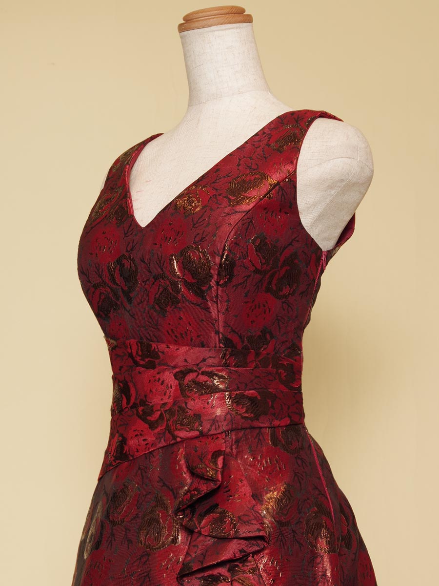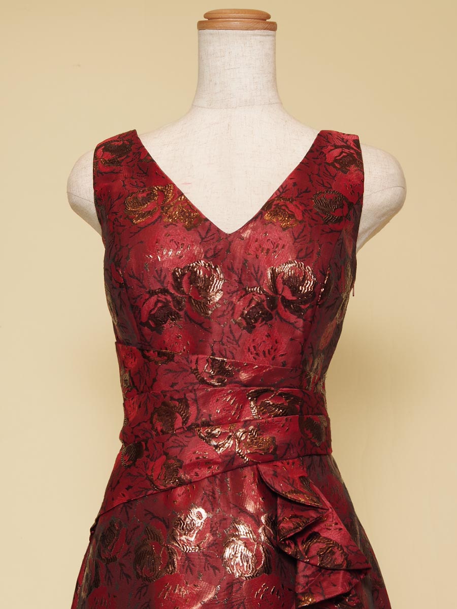 ディープなワインレッドカラーとゴールドの輝きを持たせたメタリックジャガード生地で仕上げたストレートラインの肩袖ステージドレス。
