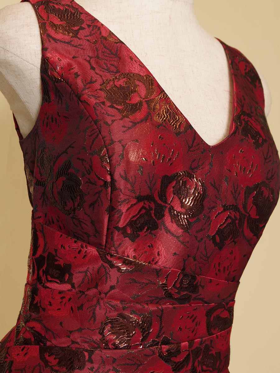 レッド×ゴールドのメタリックジャガード生地で仕上げた肩袖ストレートラインステージドレス