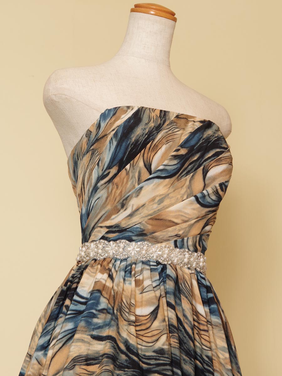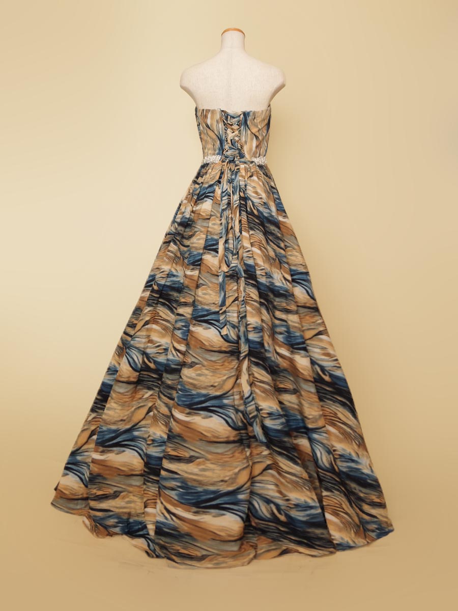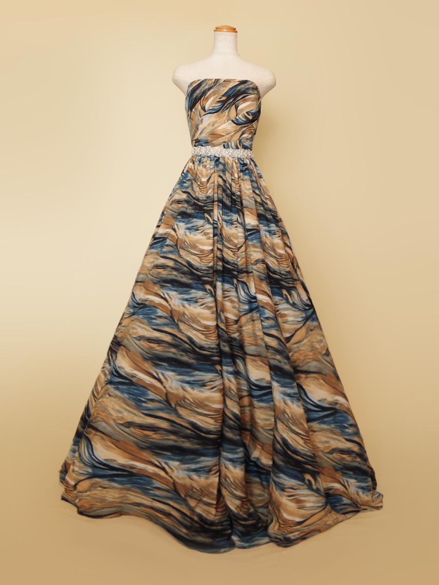 油絵のようなブルーイエロー波模様の柄をドレス全体に使用したAラインボリュームのステージドレス。