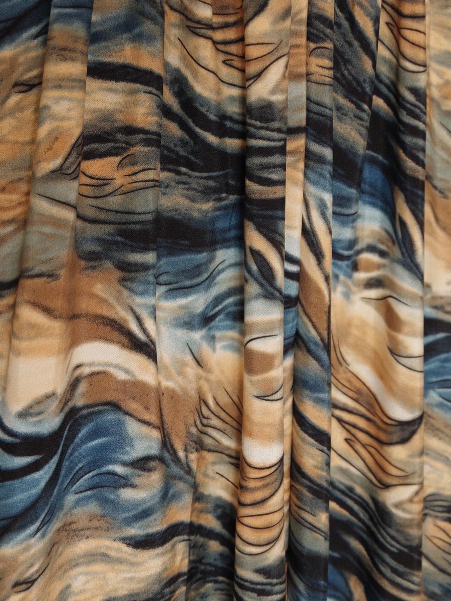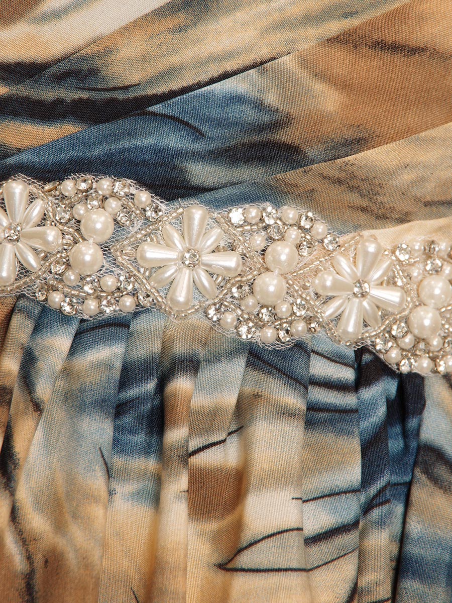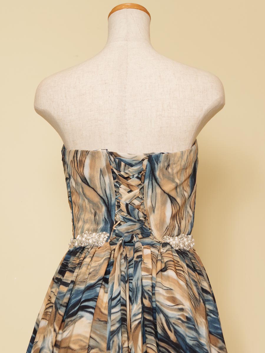 油絵のようなブルーイエロー波模様の柄をドレス全体に使用したAラインボリュームのステージドレス。