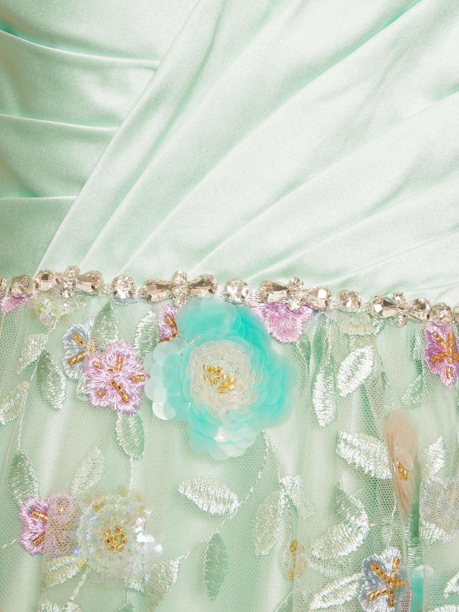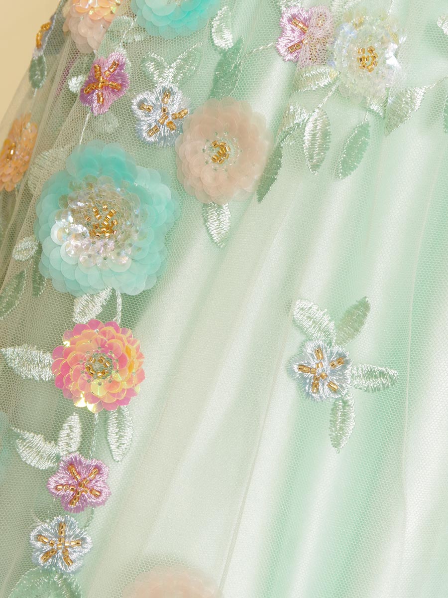 スカートのトップとボトムに立体的な花柄刺繍をグラデーション状にレイアウトすることで、ドレス全体をお花畑の様に演出しています。