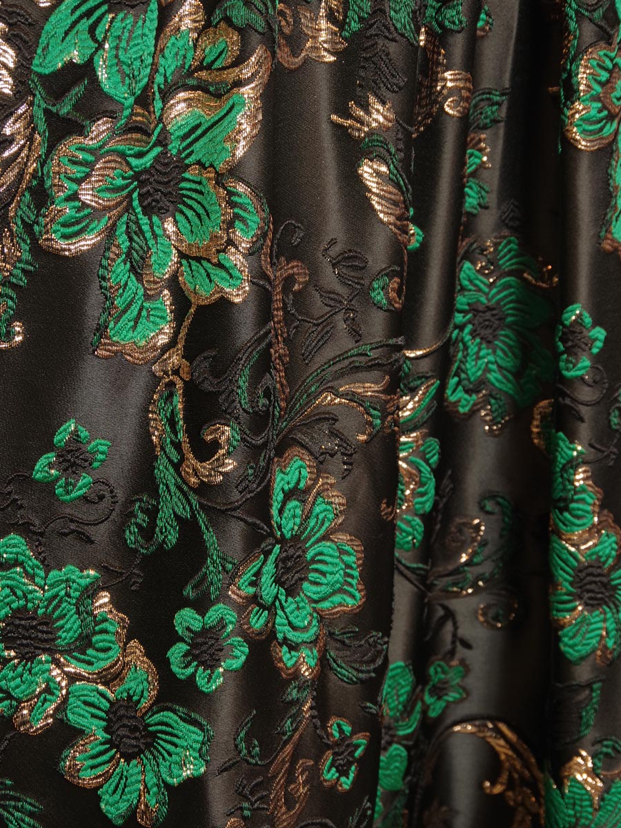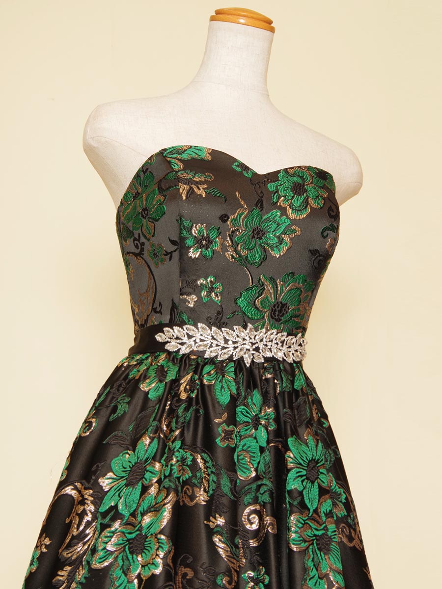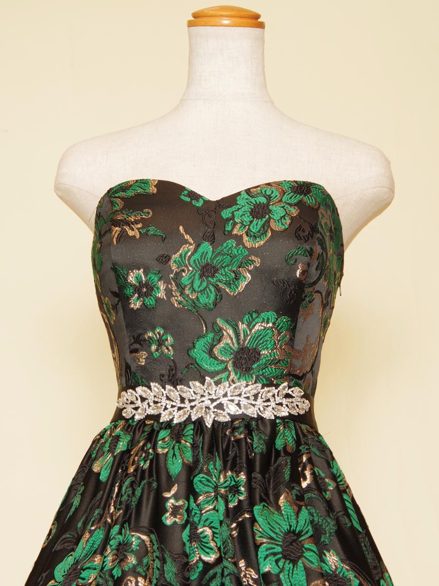 ブラックサテンを下地にしたロイヤルグリーンジャガードのボリュームシルエットのコンサートカラードレス。