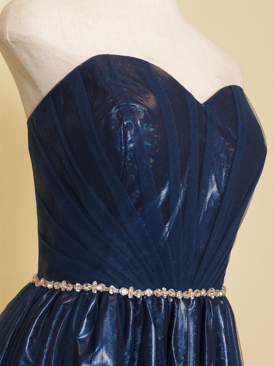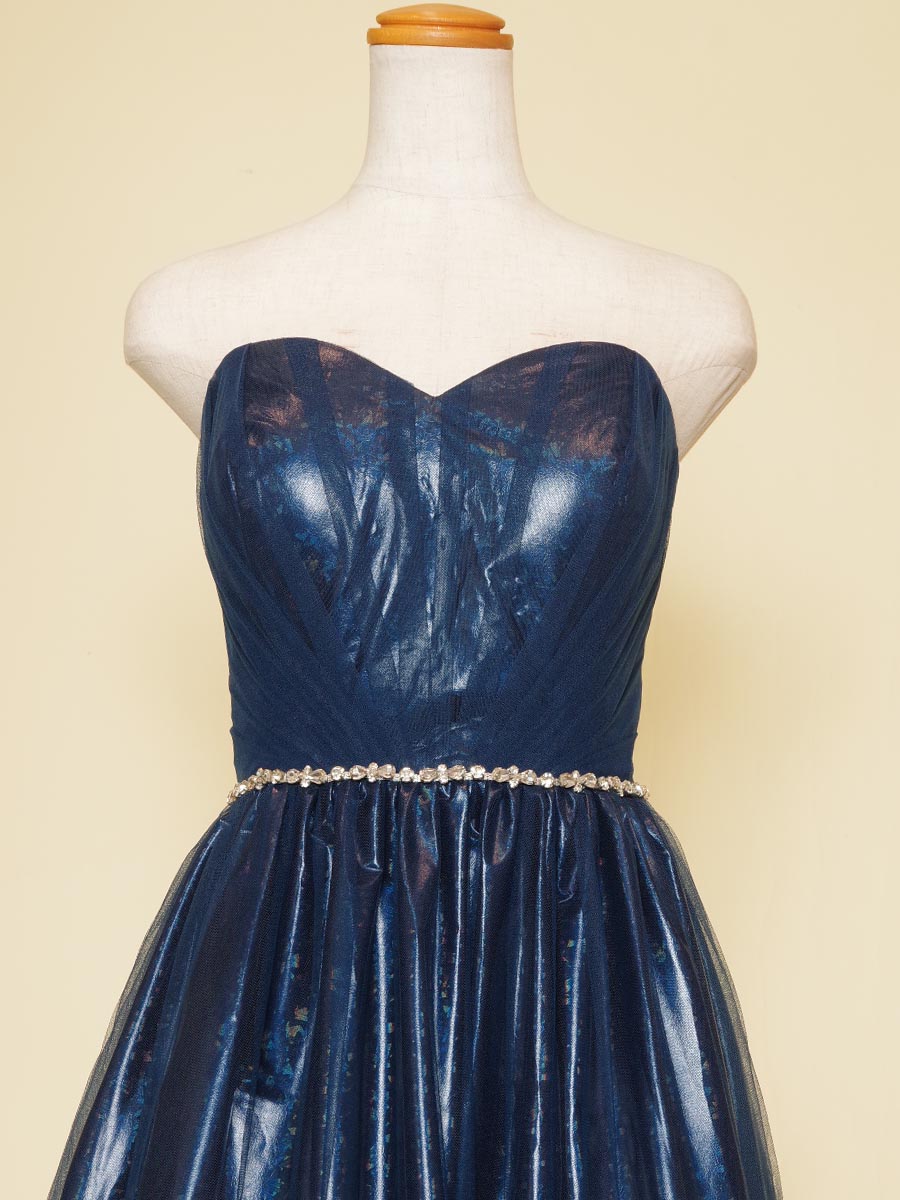 キラキラの反射効果を持たせた生地をベースにネイビーカラーのチュールを組み合わせたステージ上で美しい発光を表現してくれるステージカラードレス。
