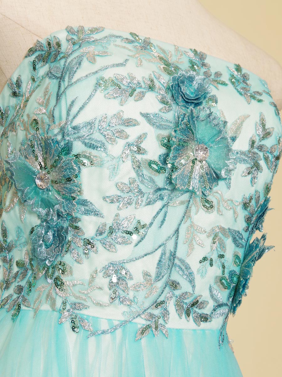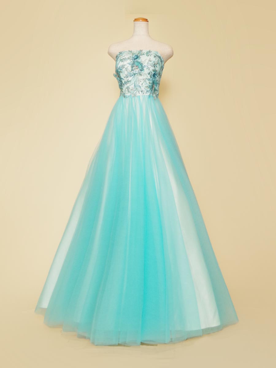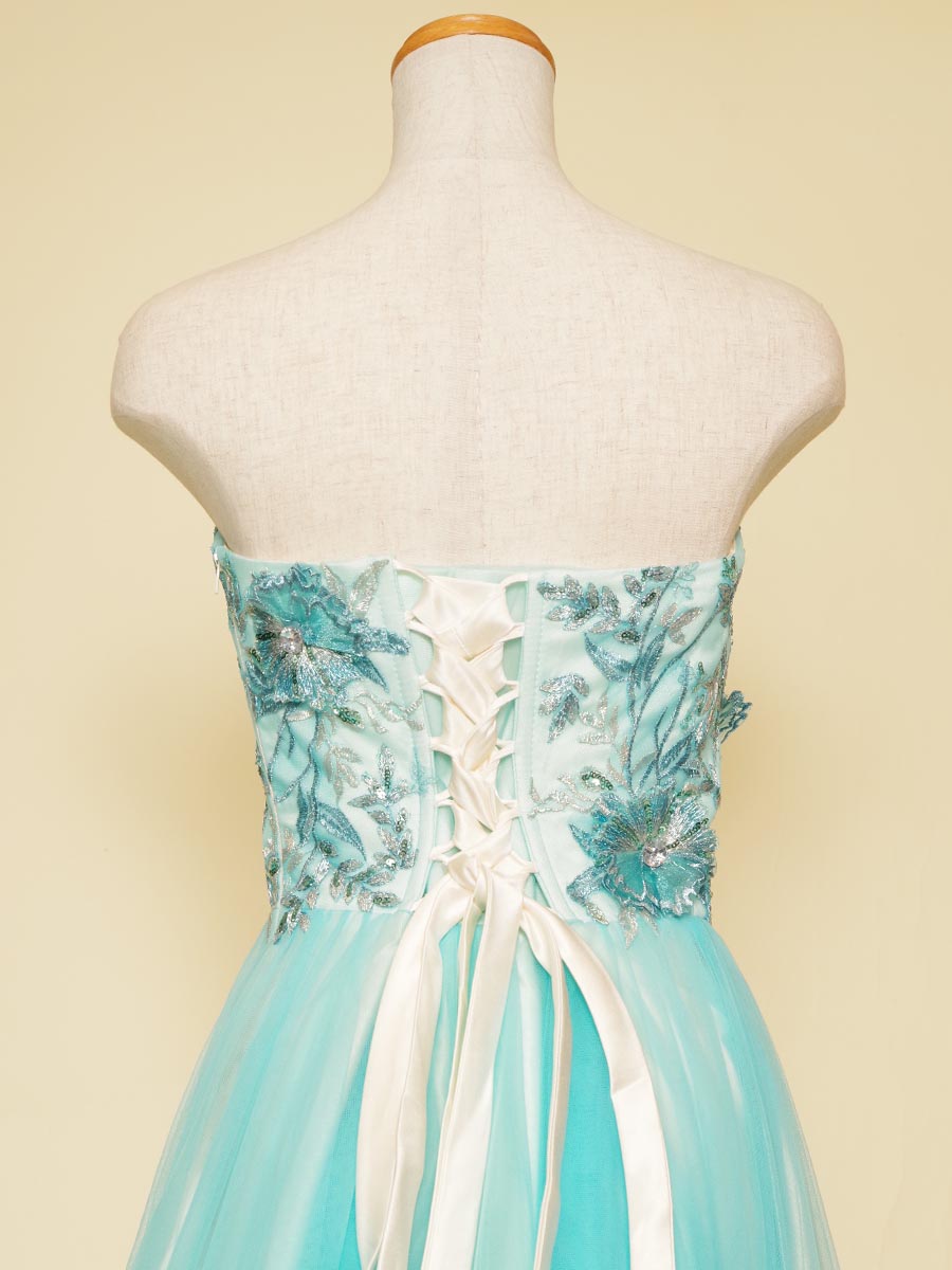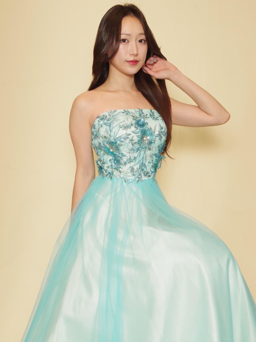 パステルアイスブルーカラーの涼しさを感じさせてくれるボリュームチュール演奏会ロングドレス