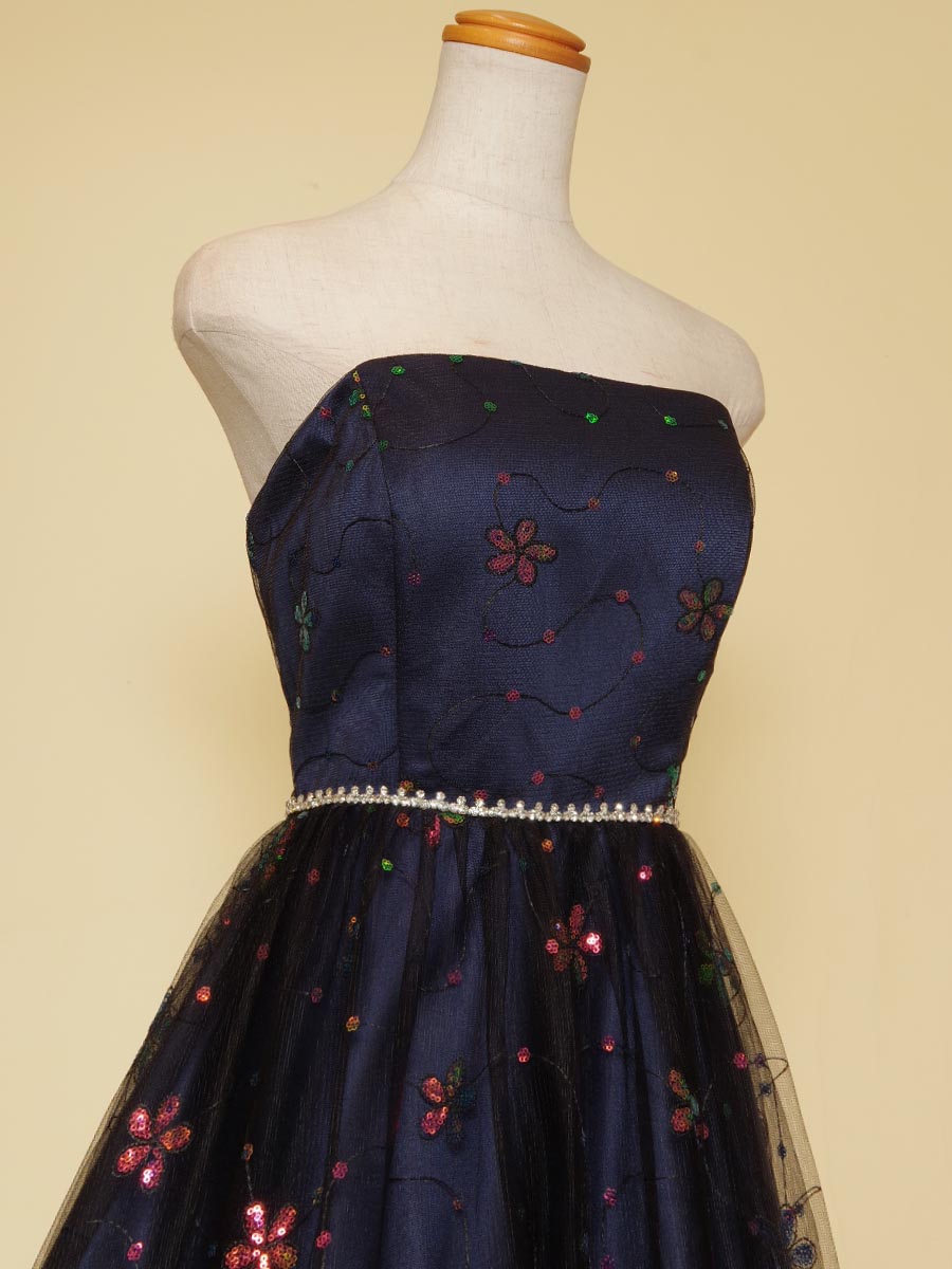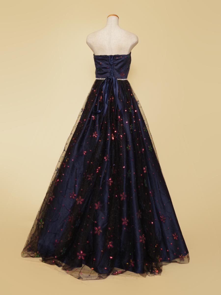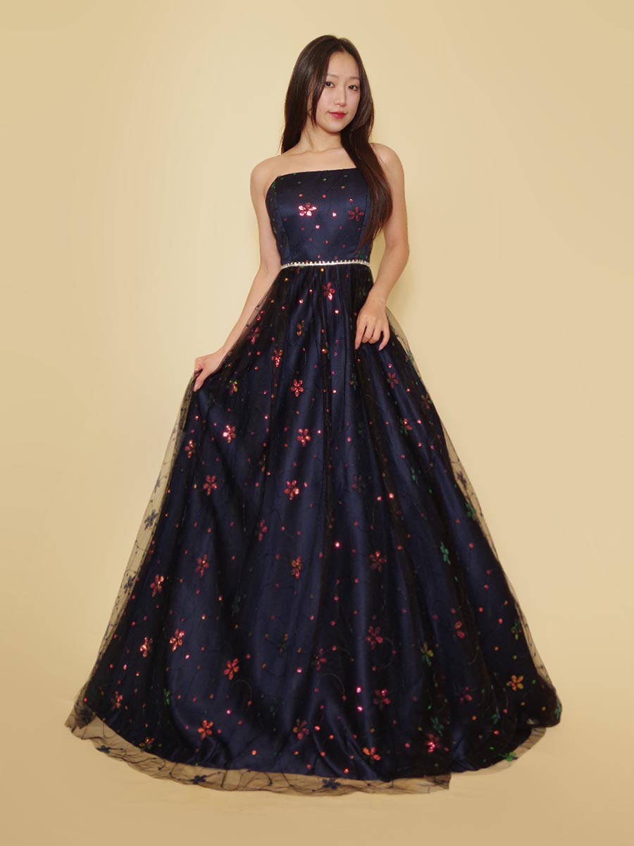 ディープネイビーカラーに花柄モチーフのスパンコール装飾を施した深みのある輝きを放つコンサートロングドレス
