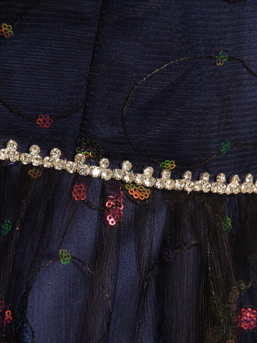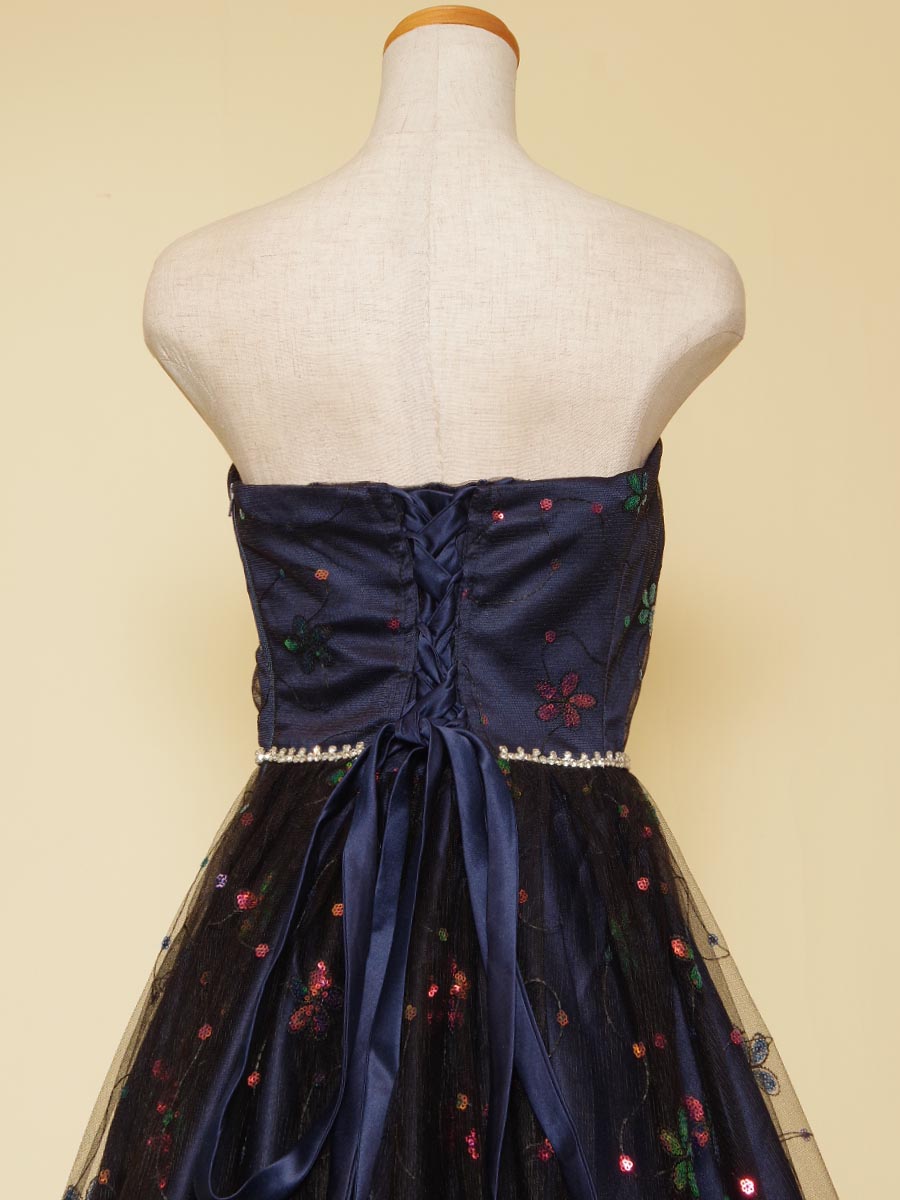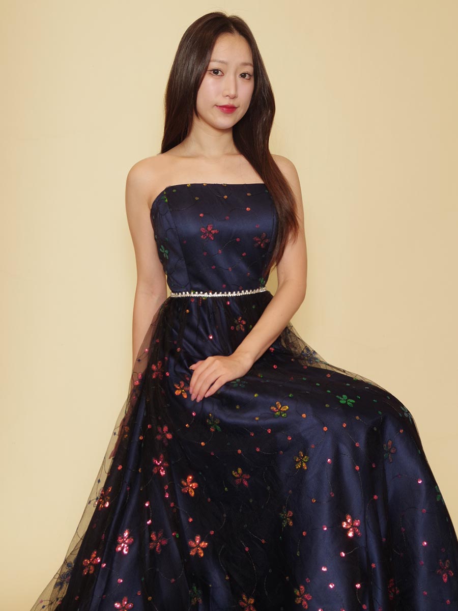 ディープネイビーカラーに花柄モチーフのスパンコール装飾を施した深みのある輝きを放つコンサートロングドレス