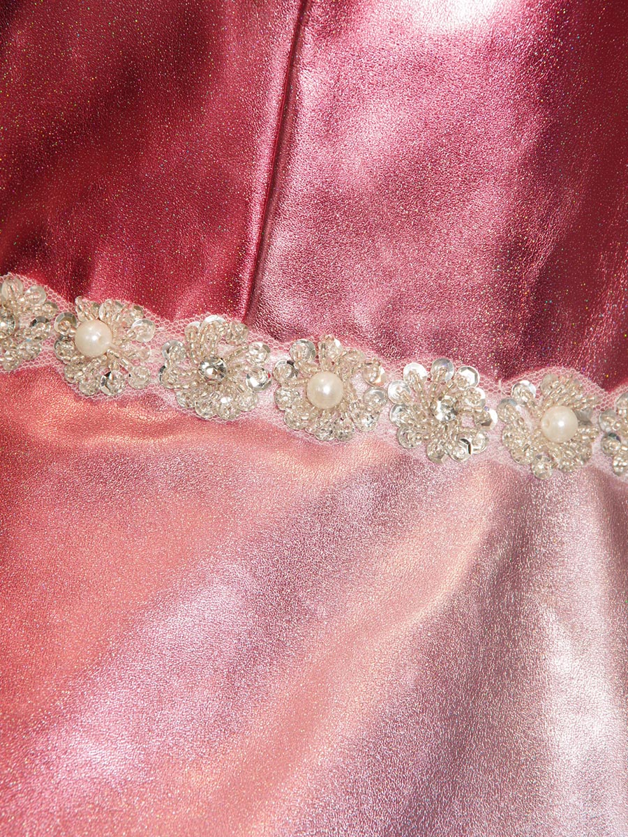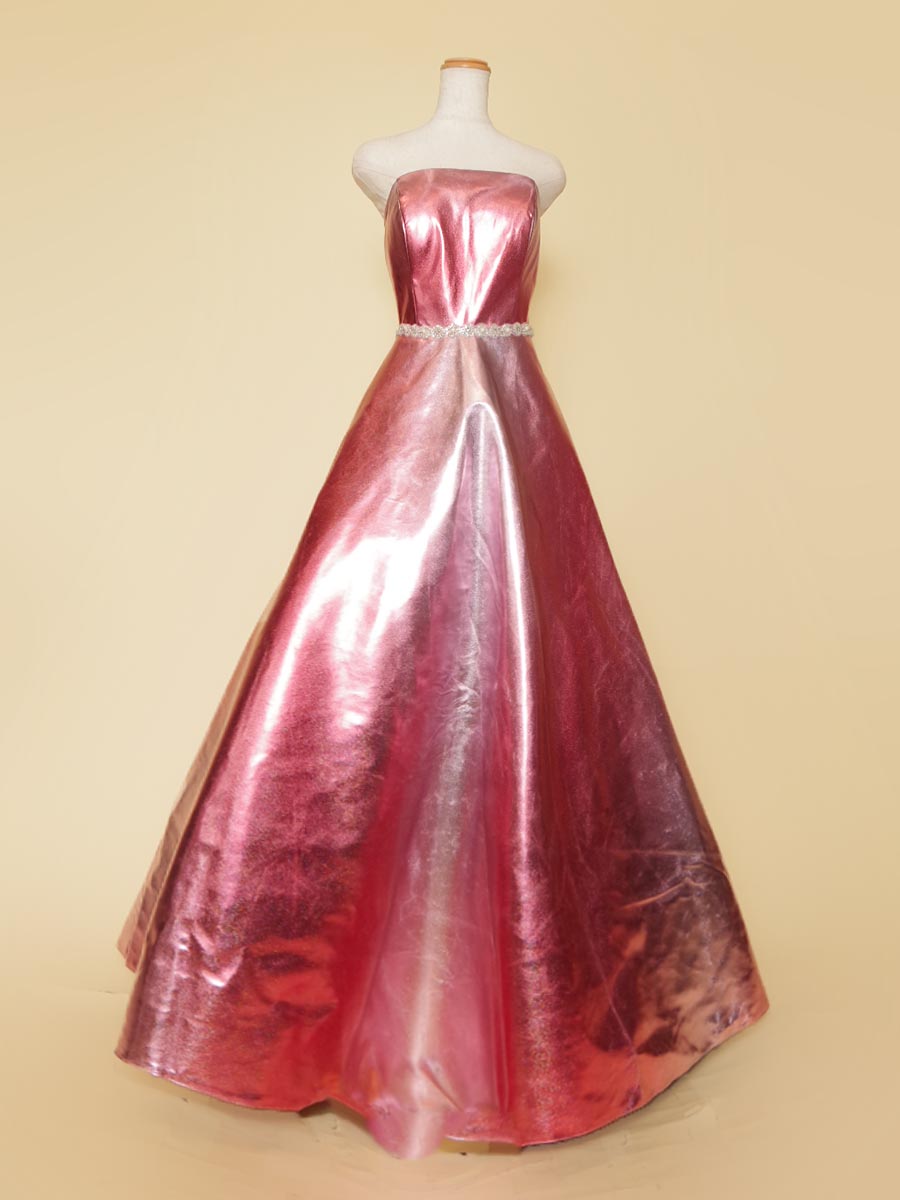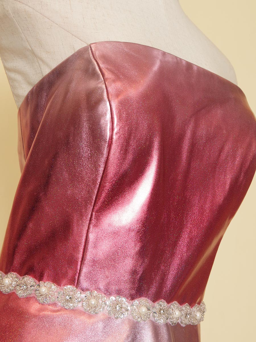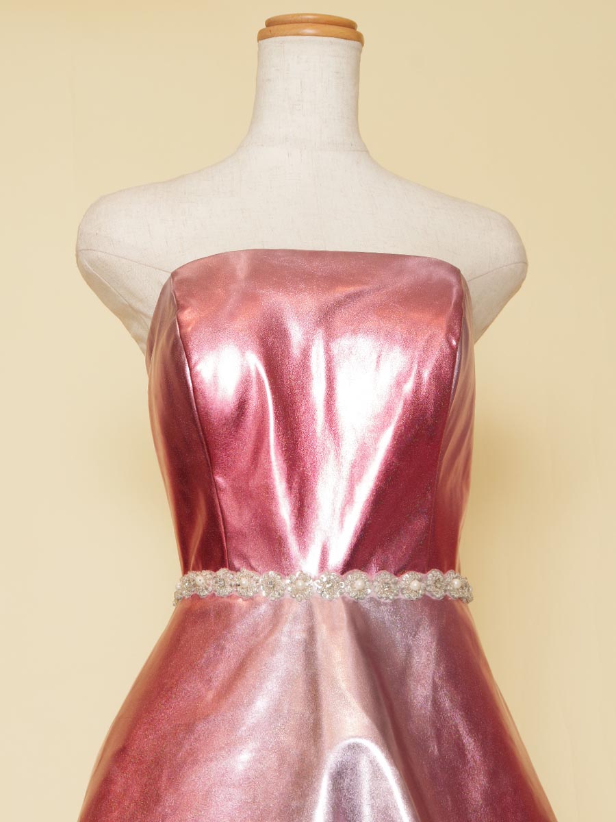 メタリックな光沢感を全体から放ってくれるサーモンレッドカラーの演奏会ボリュームロングドレス。