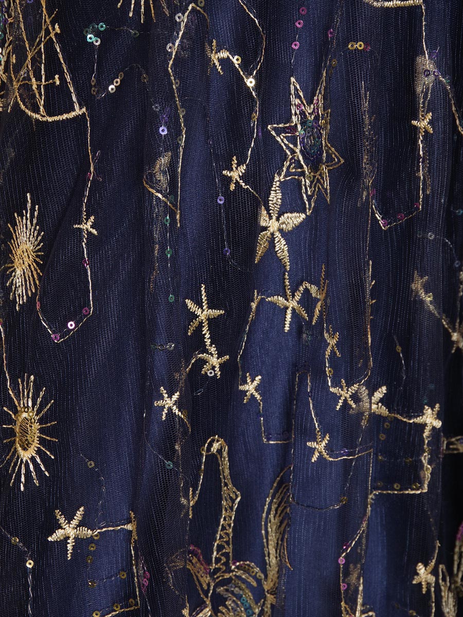 ネイビーカラーを基調にした星座柄刺繍生地を使ったボリュームステージドレス。