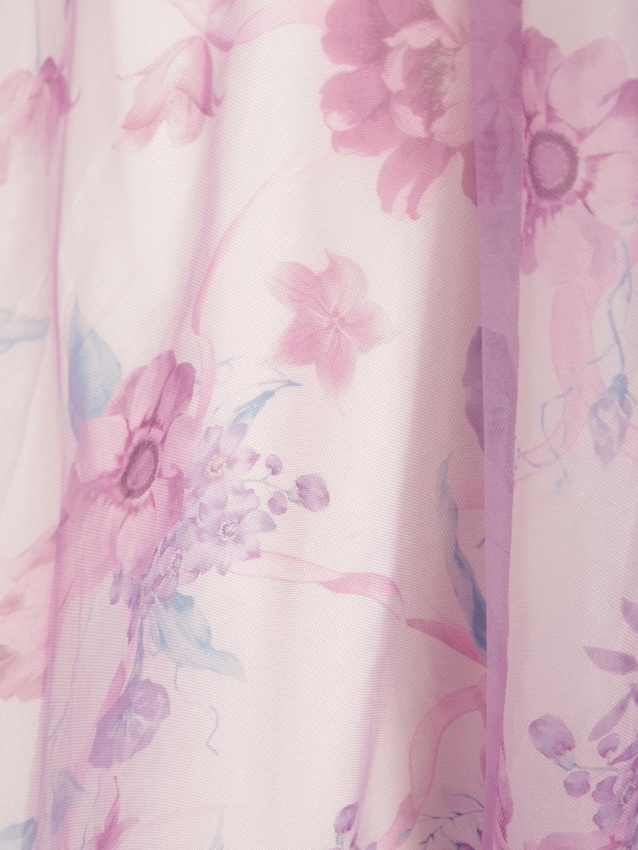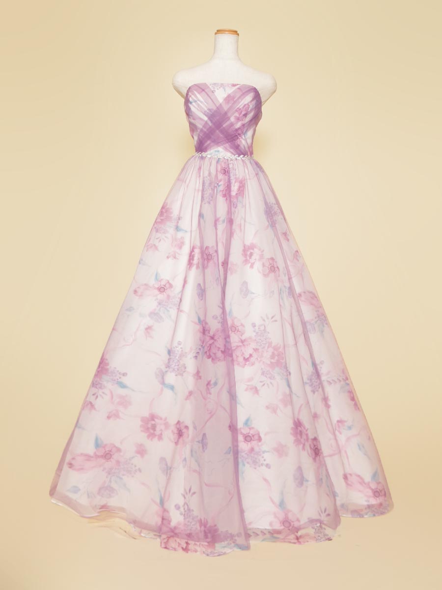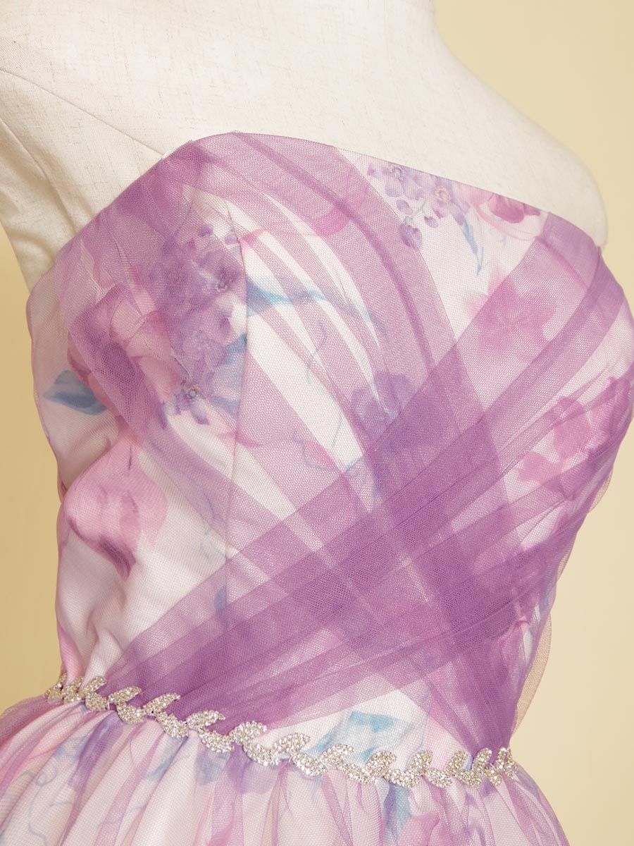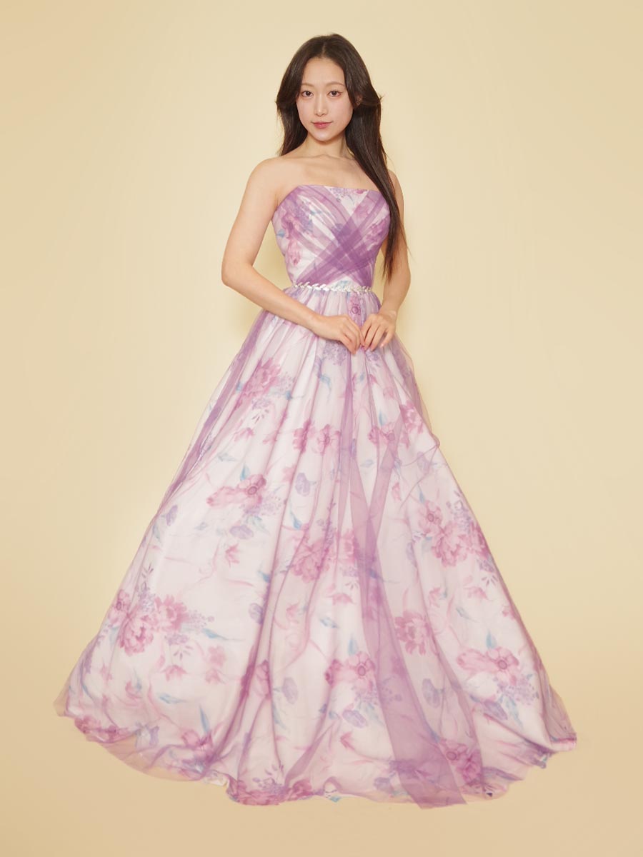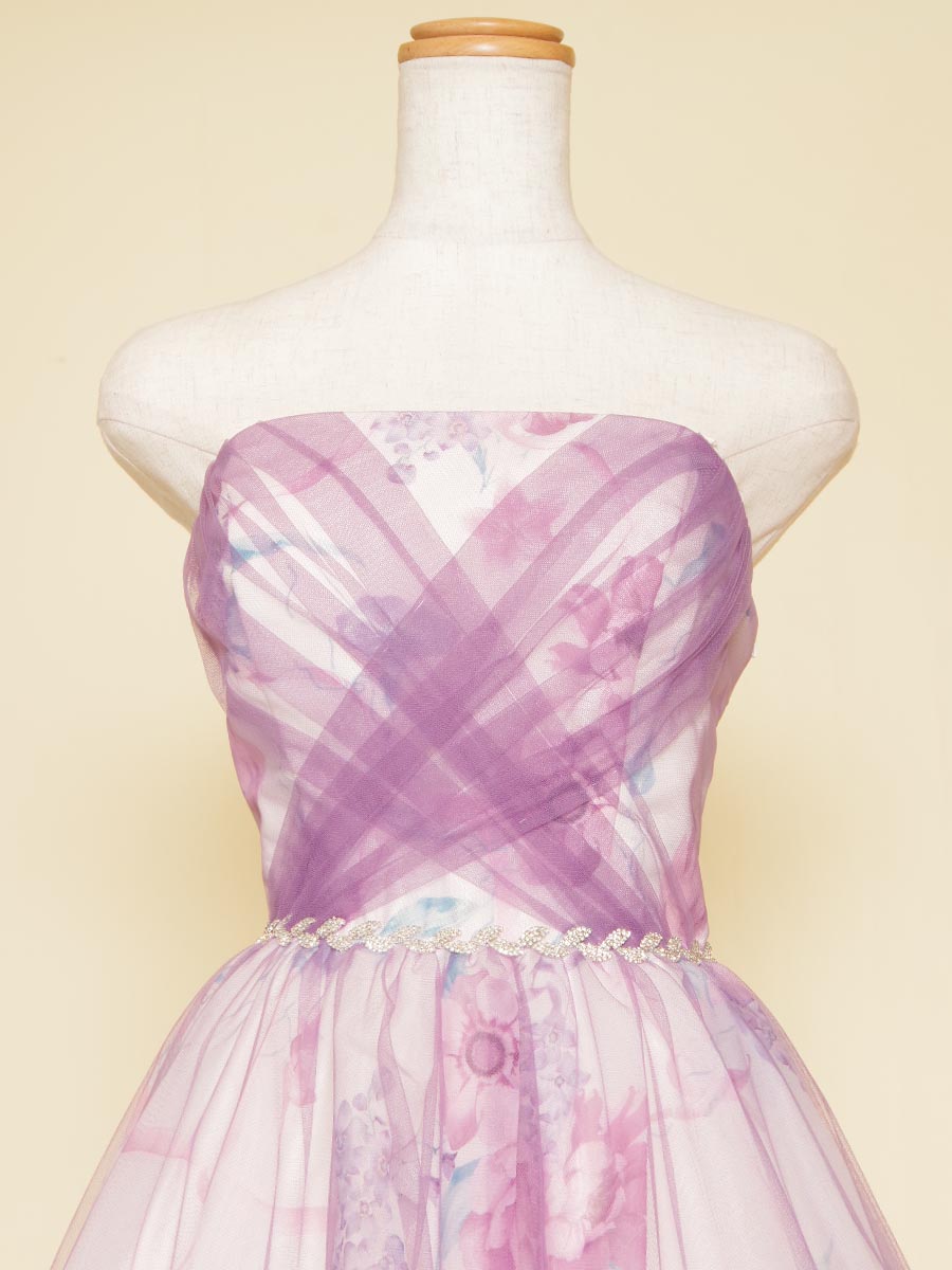 ホワイト地に花柄模様をプリントした生地にパステルパープルのチュール生地を重ねることで、軽やかな印象をドレス全体で表現しました。