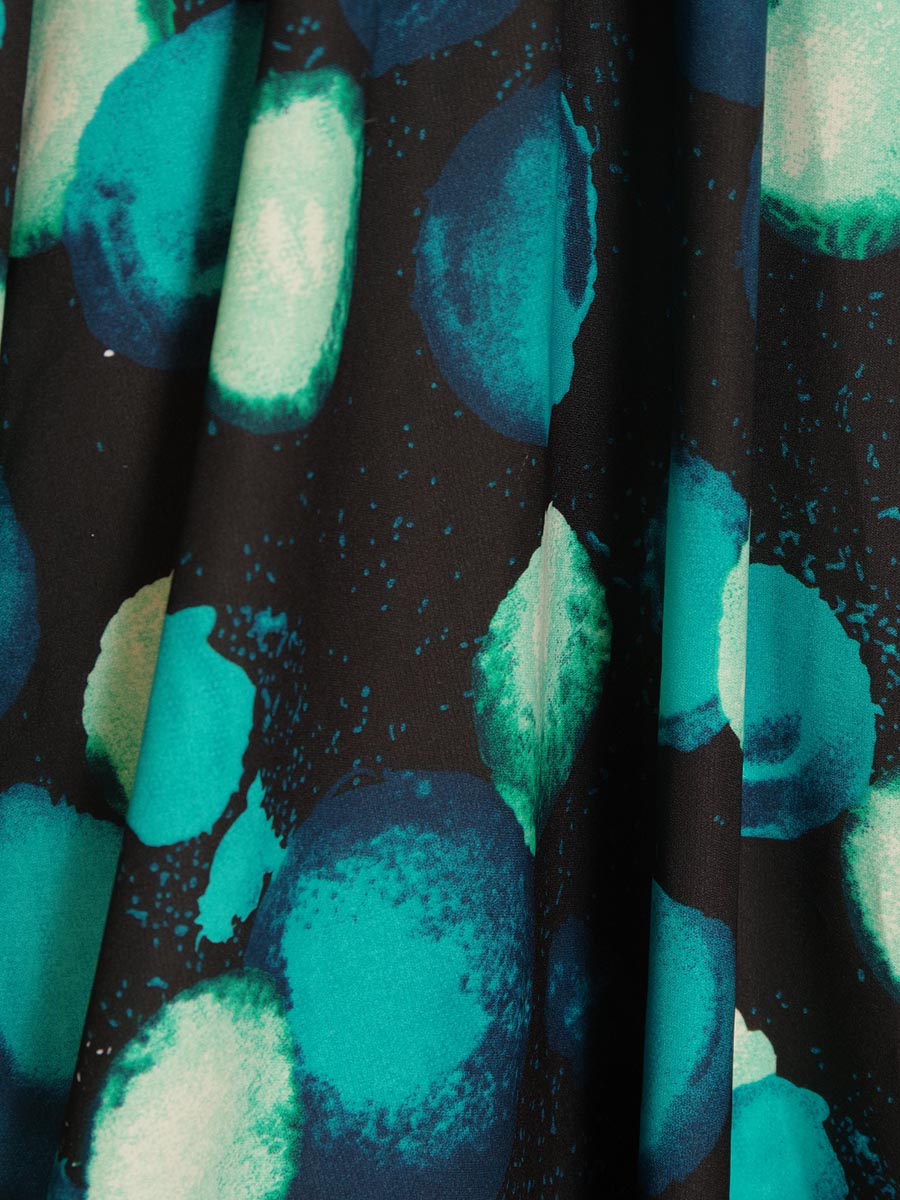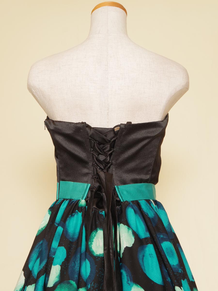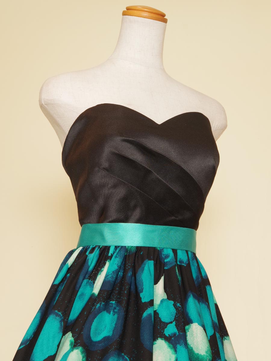 エメラルドブルー水玉模様×ブラックサテンのボリュームAラインシルエットの演奏会ロングドレス