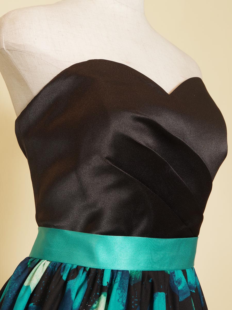 個性的な水玉模様デザインのスカートにシンプルなブラックサテンバストトップを組み合わせた演奏会Aラインドレス