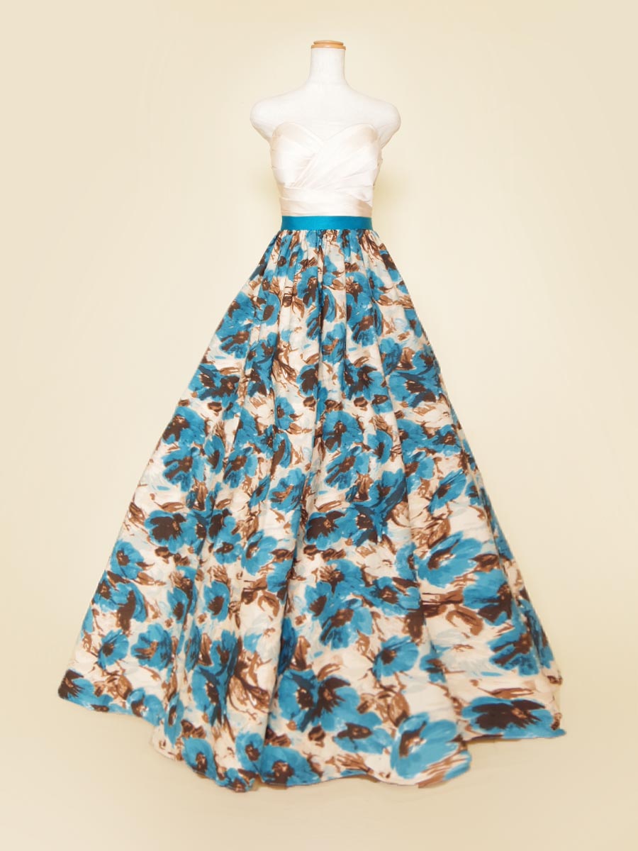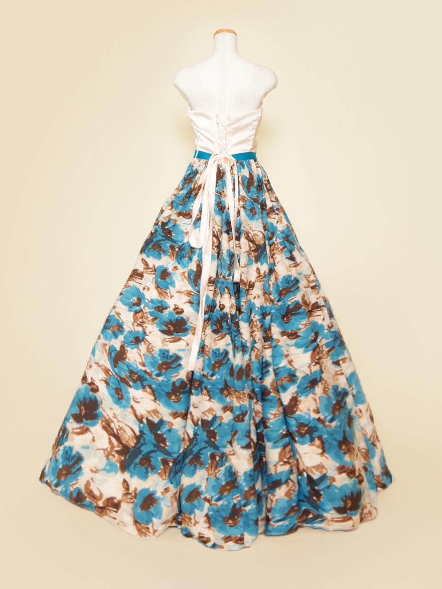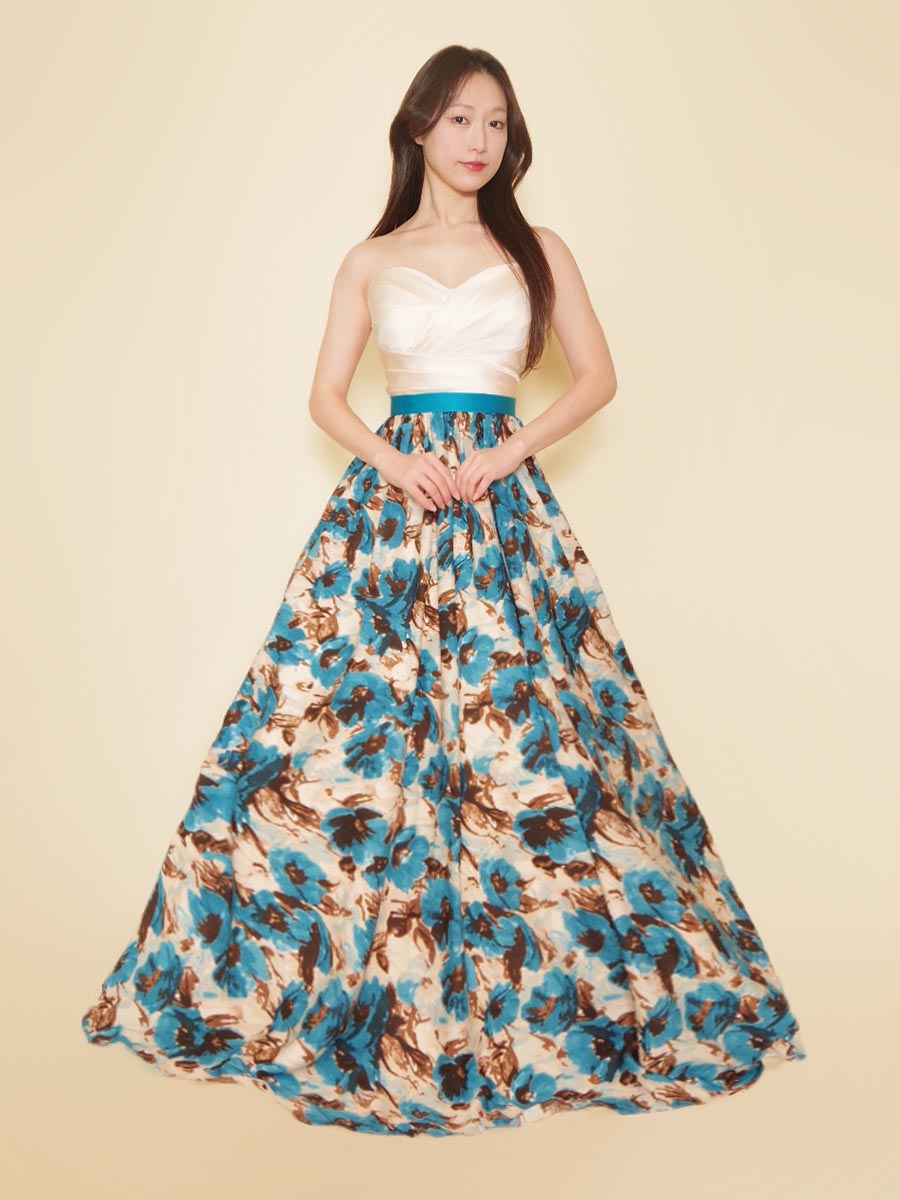 爽やかな印象のブルーの花柄デザインスカートを採用した、可愛らしさ溢れる演奏会ボリュームドレス。
