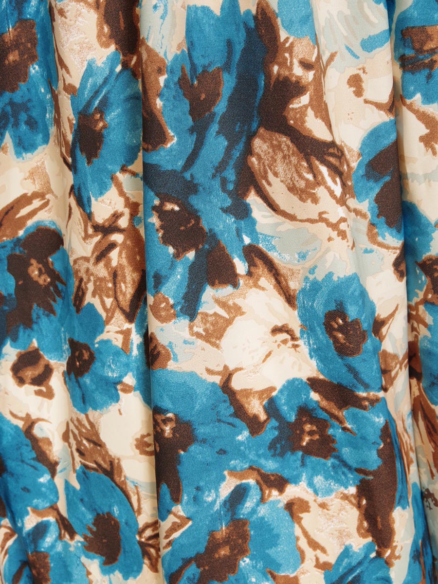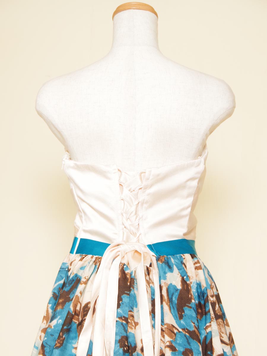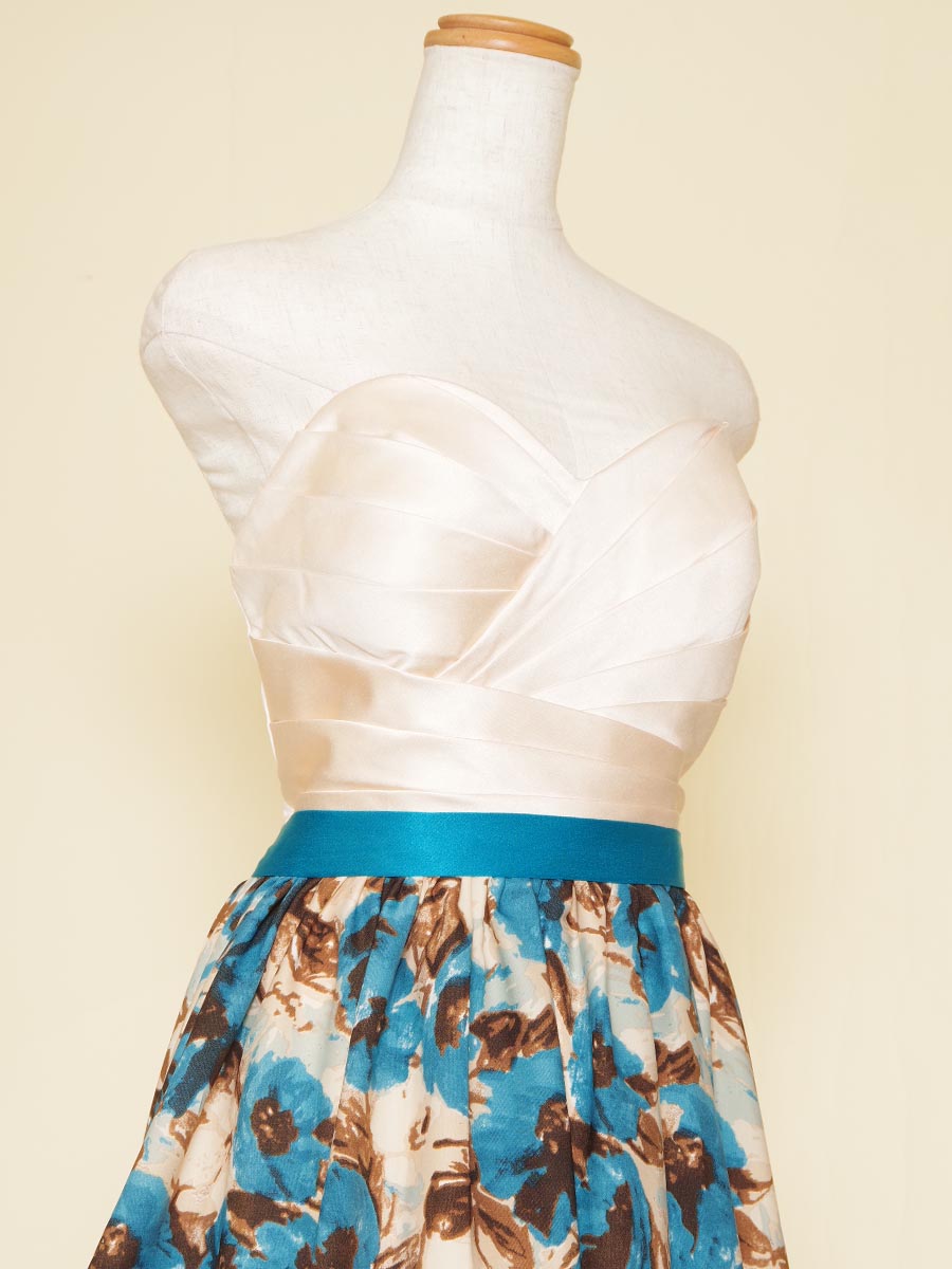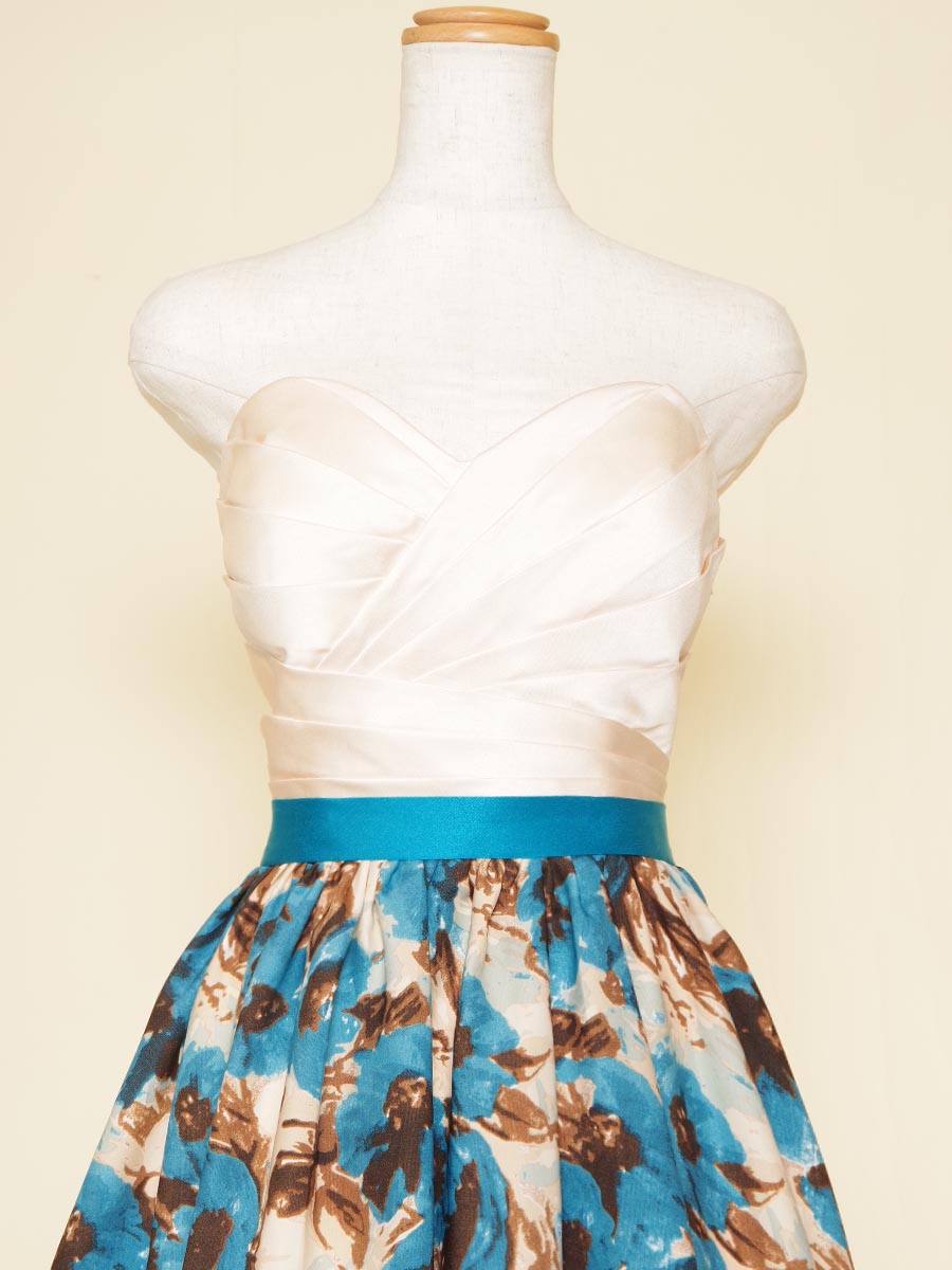 爽やかな印象のブルーの花柄デザインスカートを採用した、可愛らしさ溢れる演奏会ボリュームドレス。