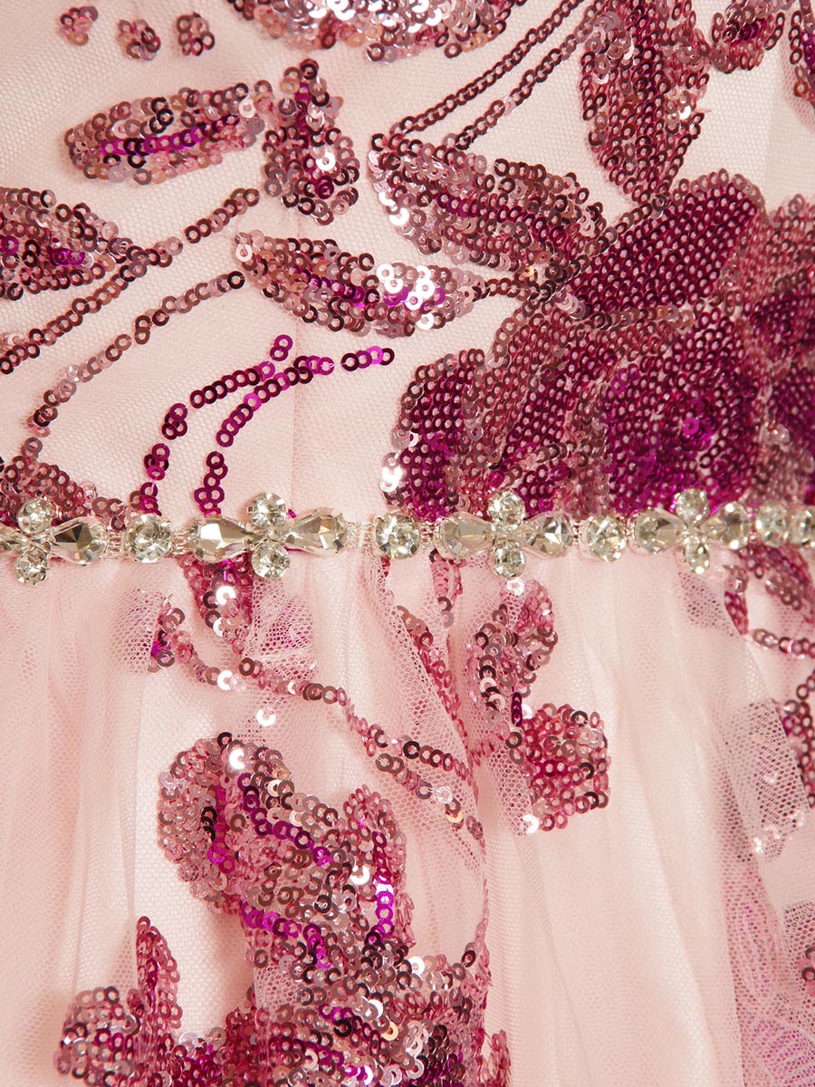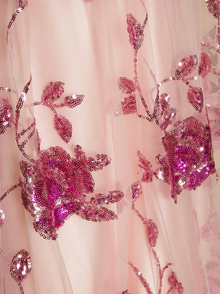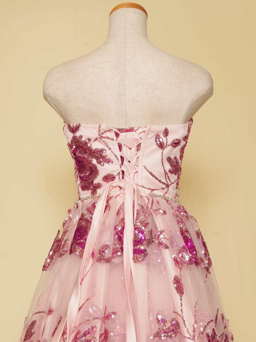 パステルピンクの優しい色合いが魅力のフラワーモチーフスパンコール装飾を施したAラインフォルムの演奏会ロングドレス。