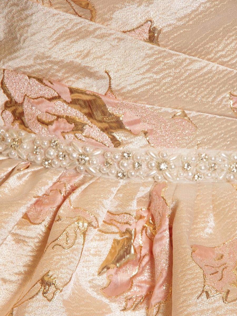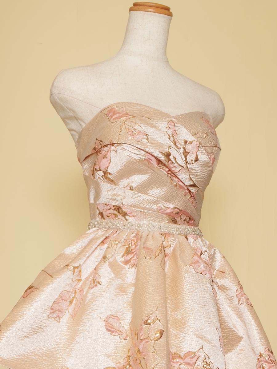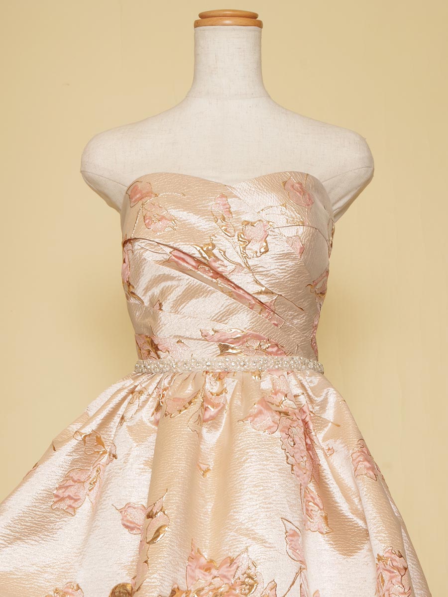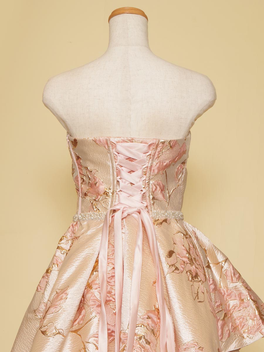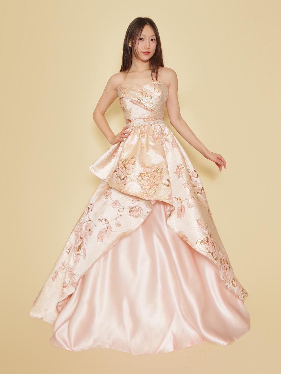 パステルピンクゴールドのゴージャスレイヤーデザインの演奏会ボリュームドレス