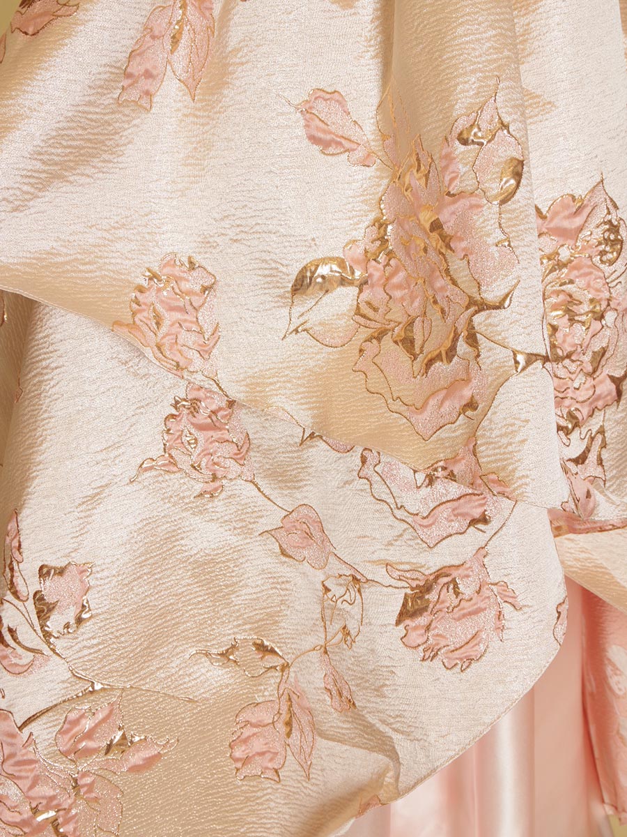 スカートのデザインをジャガード生地とパステルピンクサテンをレイヤー状に重ねたデザインでキュートでありながら豪華な存在感をステージ上で演出出来ます。
