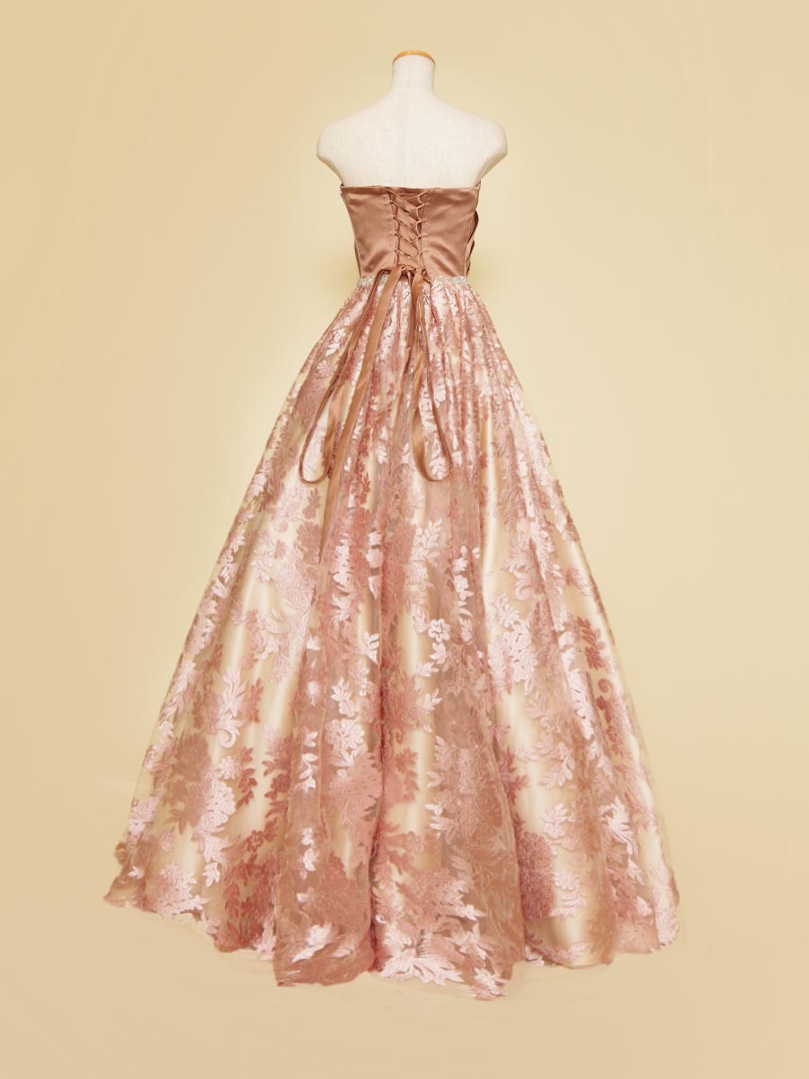 ブラウンカラーのサテンをバストトップにレイアウトして、スカートをスモーキーピンクカラーのレースで軽やかな雰囲気を演出した演奏会カラードレス。