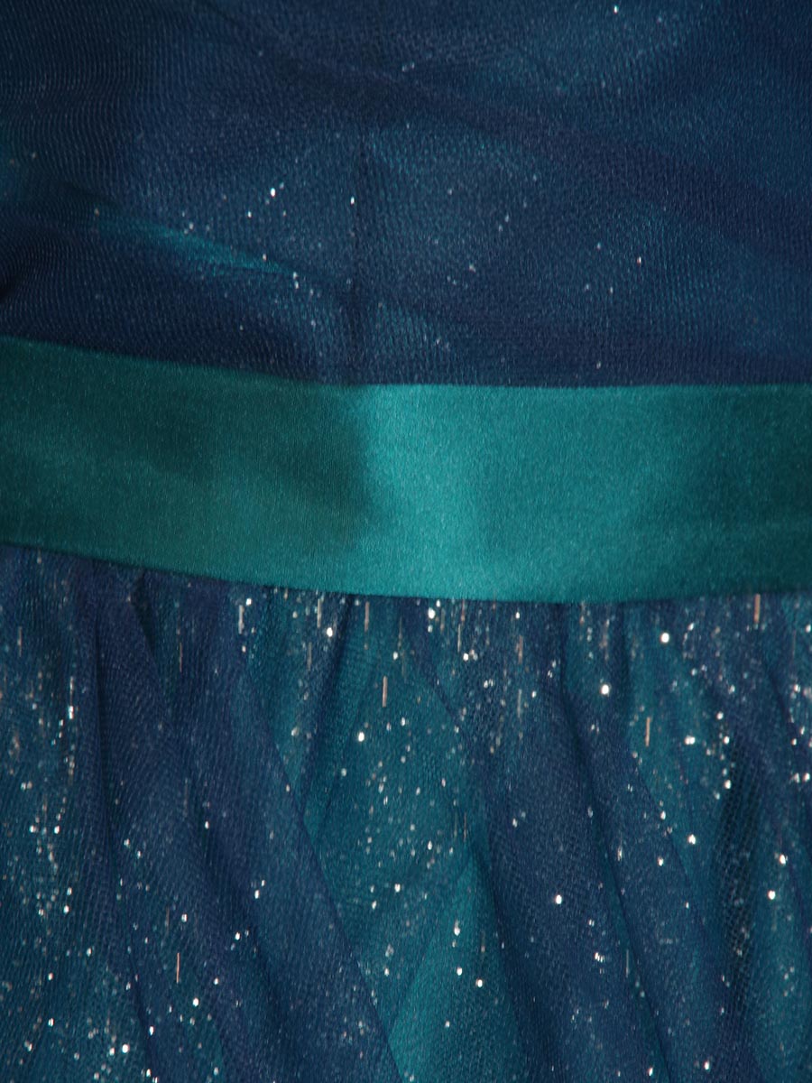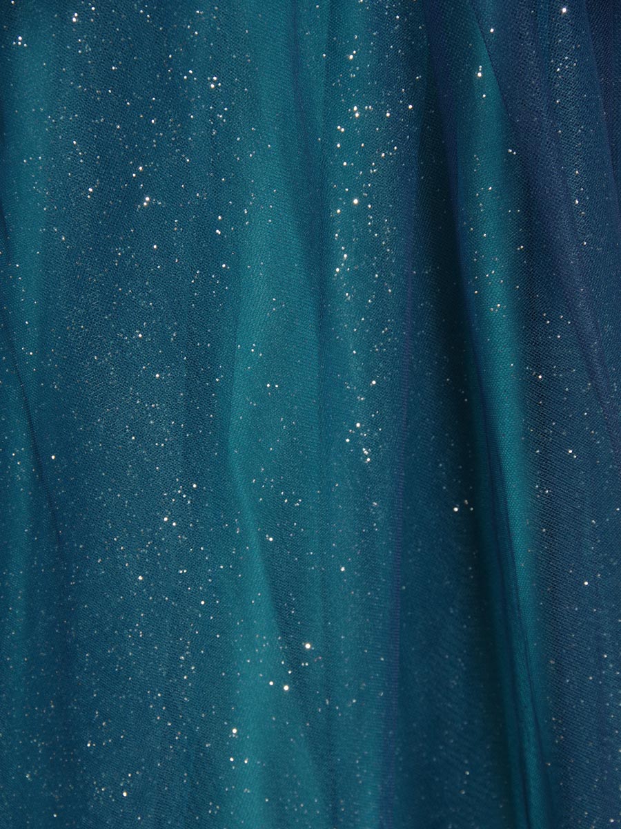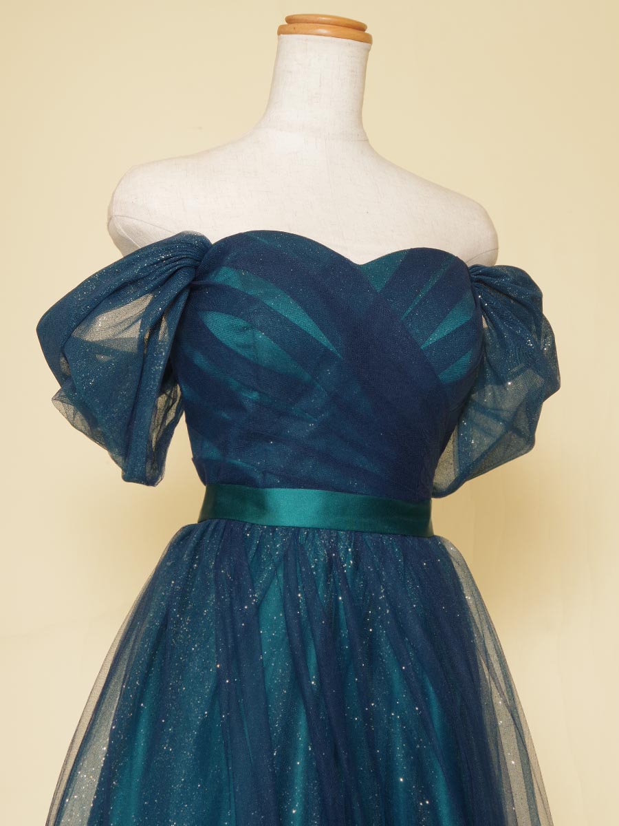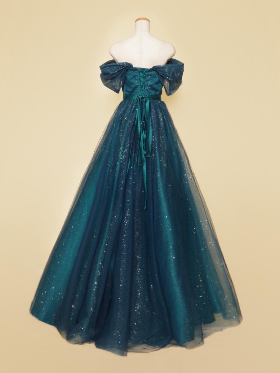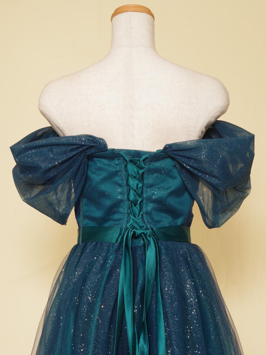 ステージ映え抜群のエメラルドカラー×ネイビーの深みのある色合いにグリッター装飾を施してキラキラ感を強く持たせた演奏会オフショルダーカラードレス。
