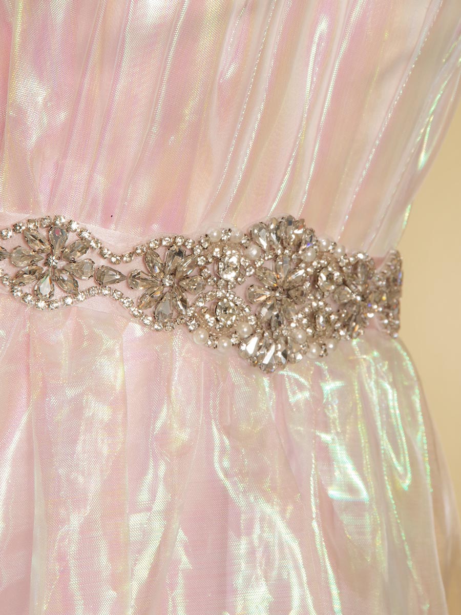 まるでパールのような美しい光沢感を演出したオーロラピンクカラーの演奏会カラードレス。
