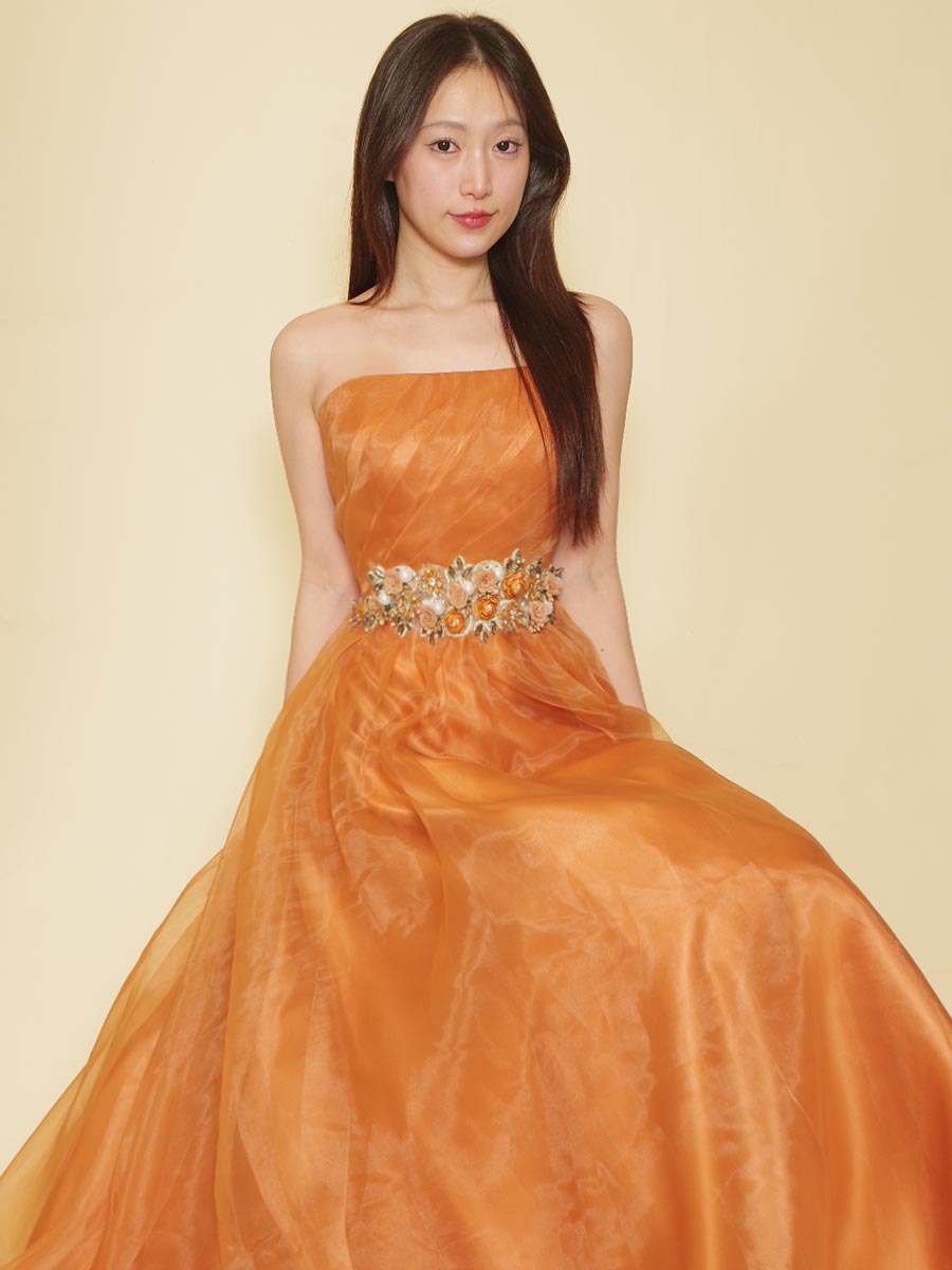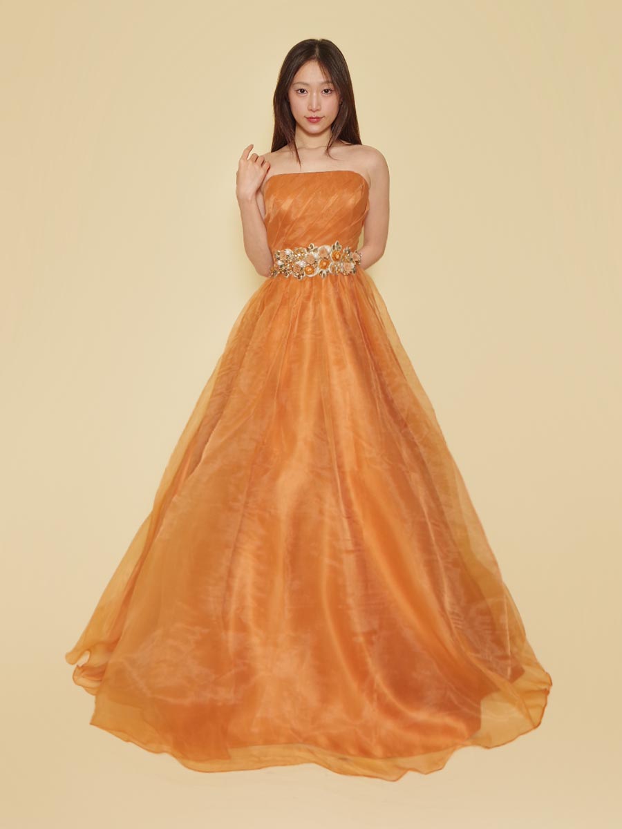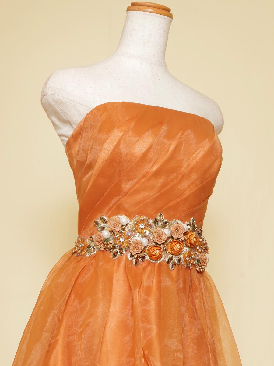 オレンジカラーの総オーガンジーデザインウエストゴージャス装飾のステージドレス