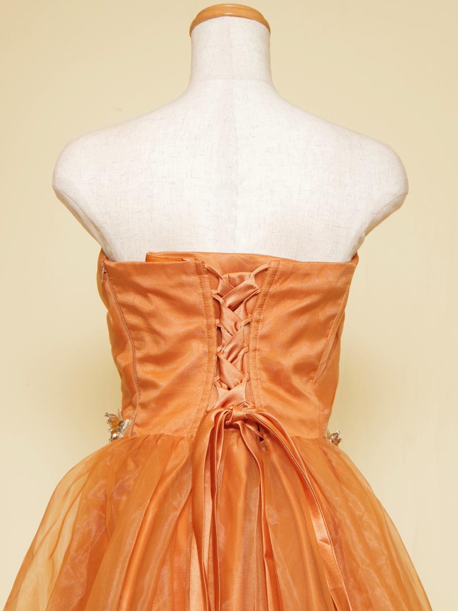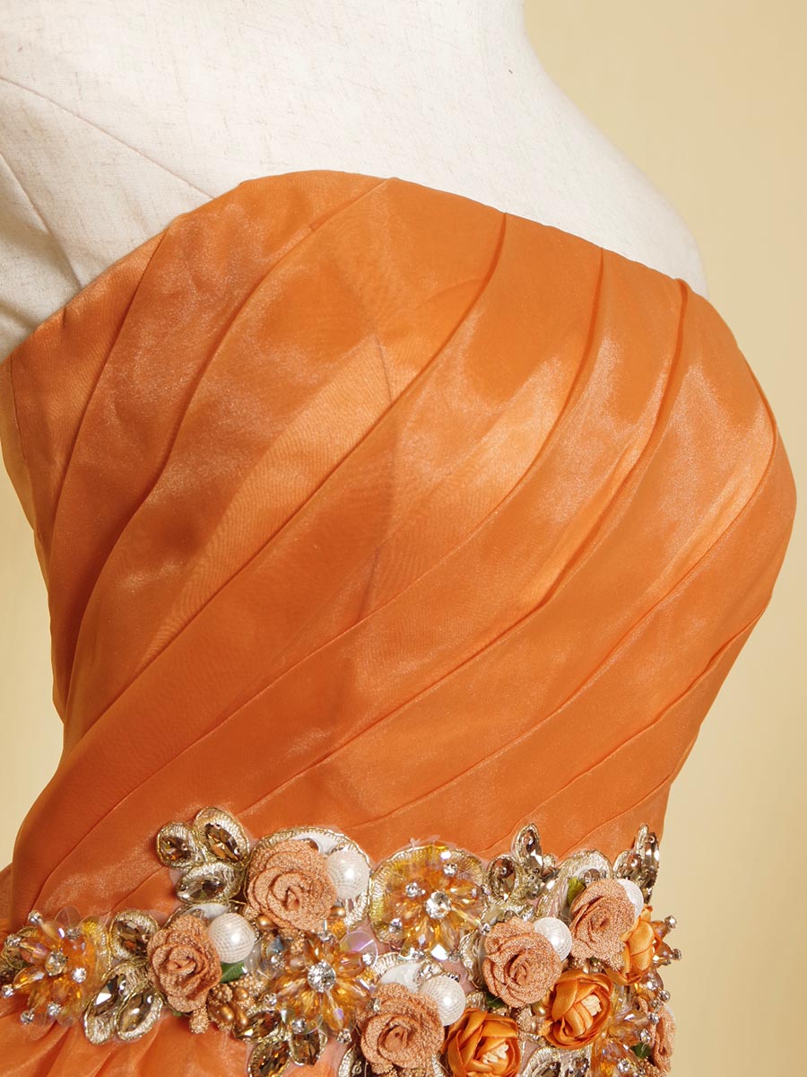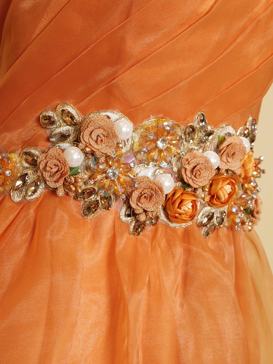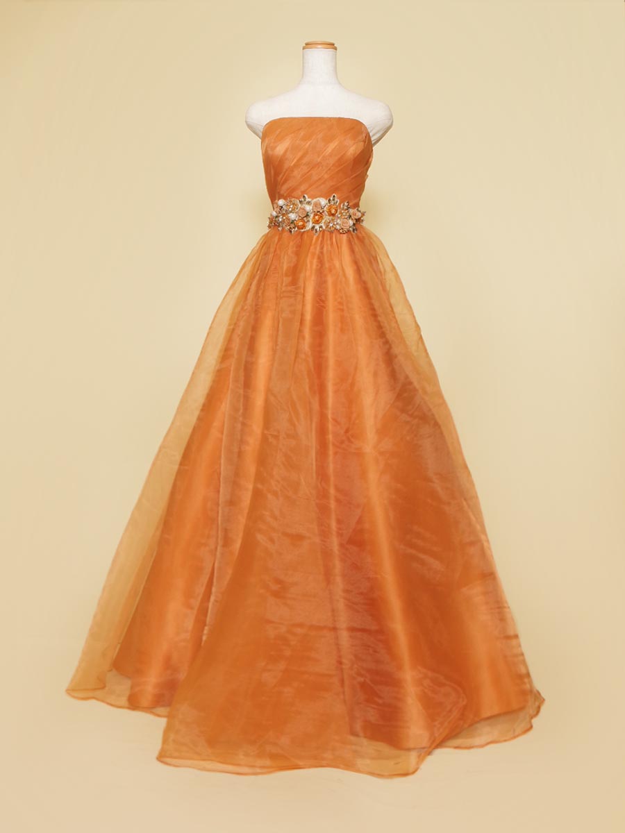 オレンジカラーの総オーガンジーデザインウエストゴージャス装飾のステージドレス