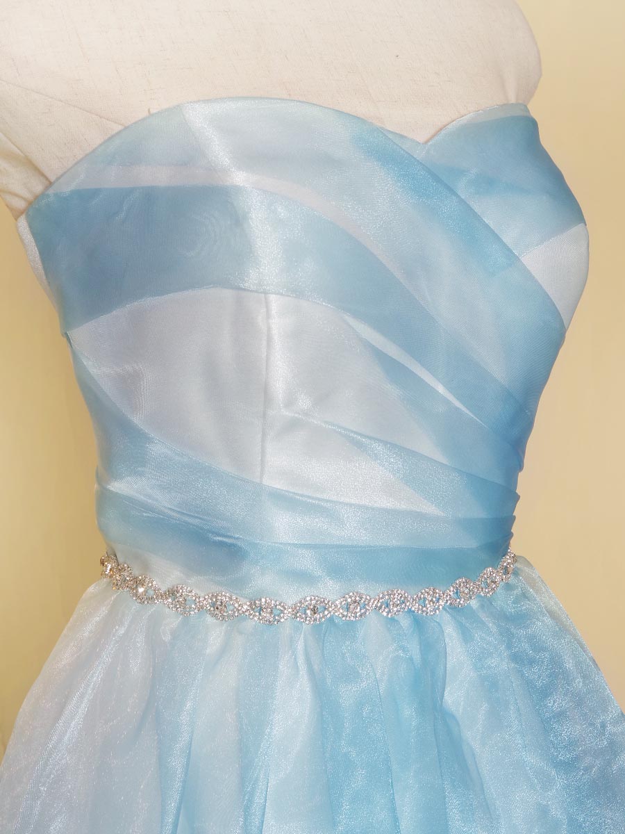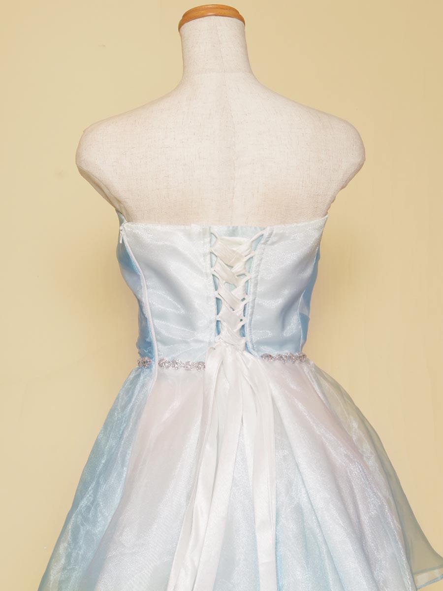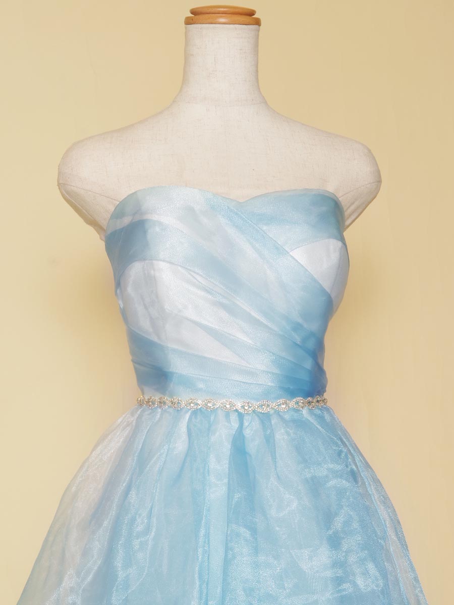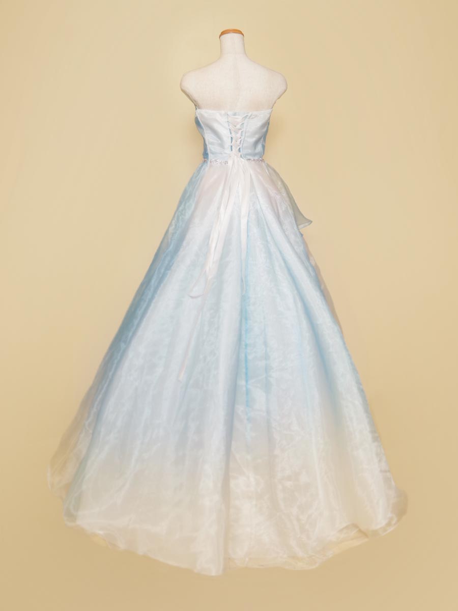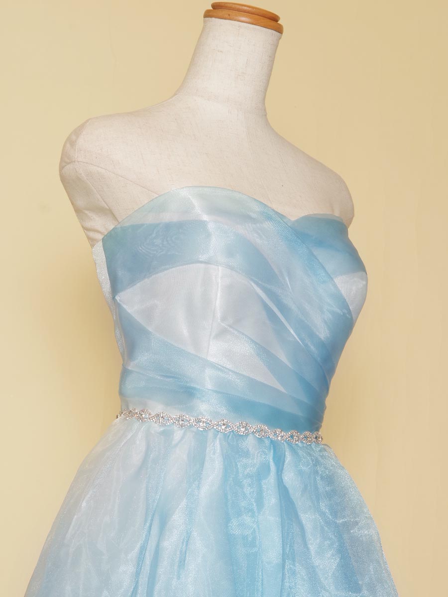 全体に艶やかなオーガンジー生地を使用することで、スカイブルーの淡い色合いとマッチして透明感のある雰囲気をドレス全体で表現しています。