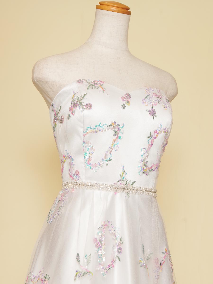 ホワイトカラーを基調にパステルカラーのスパンコール装飾を施した透明感溢れるスレンダーフォルムのAラインドレス。