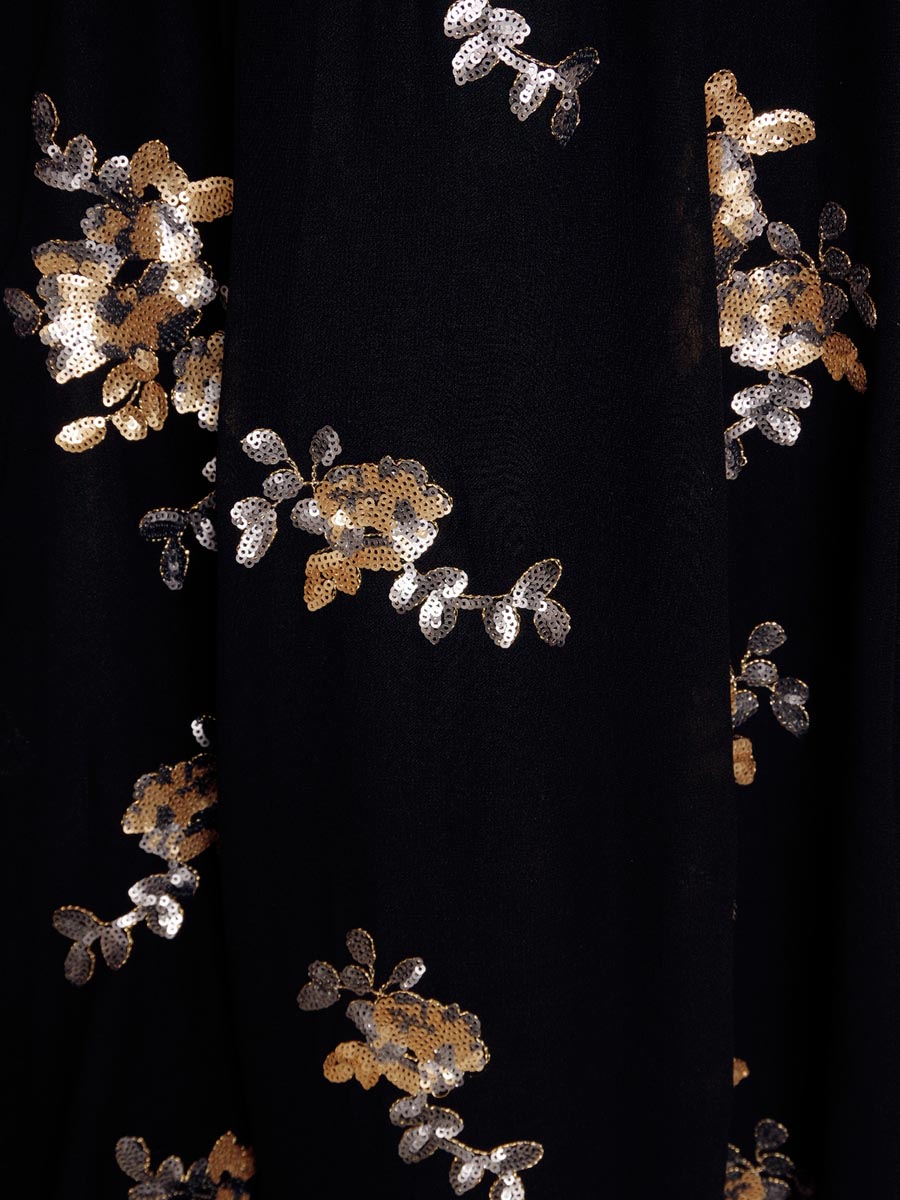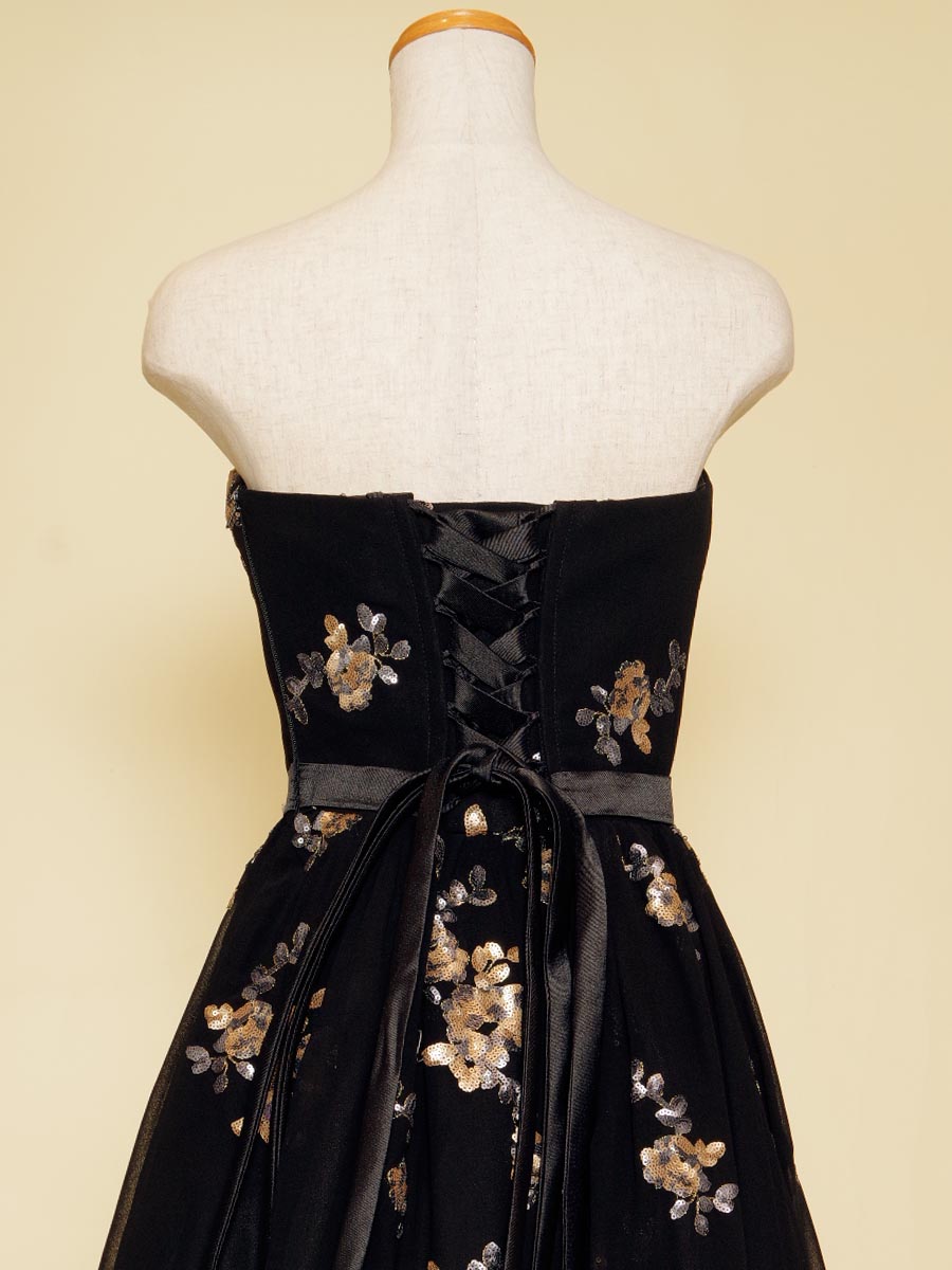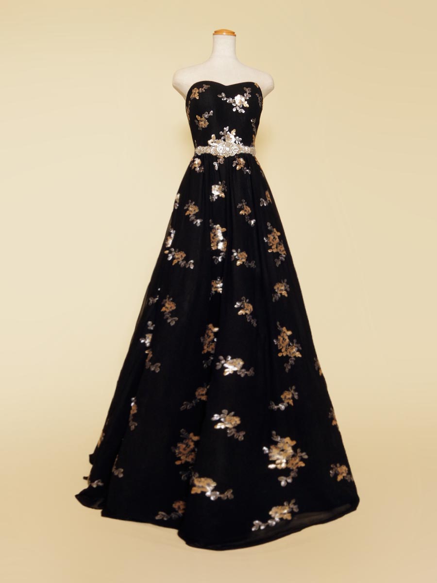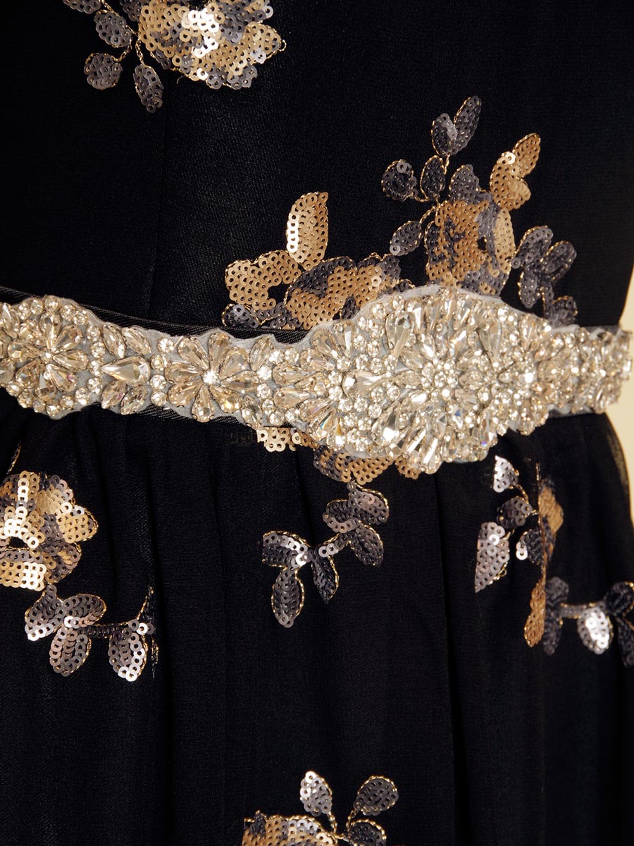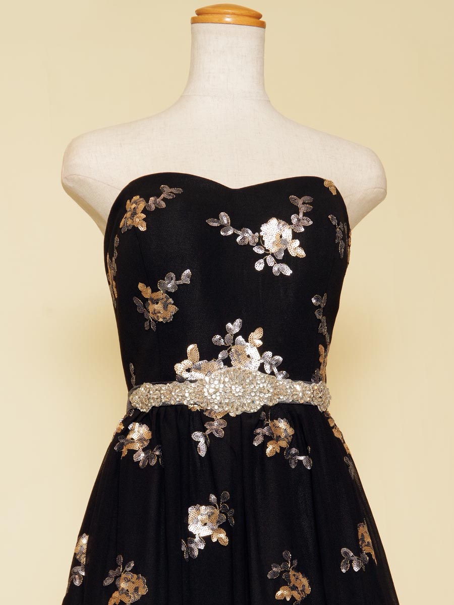 ブラックシフォンに花柄モチーフのスパンコール装飾を加えたスレンダーAラインドレス