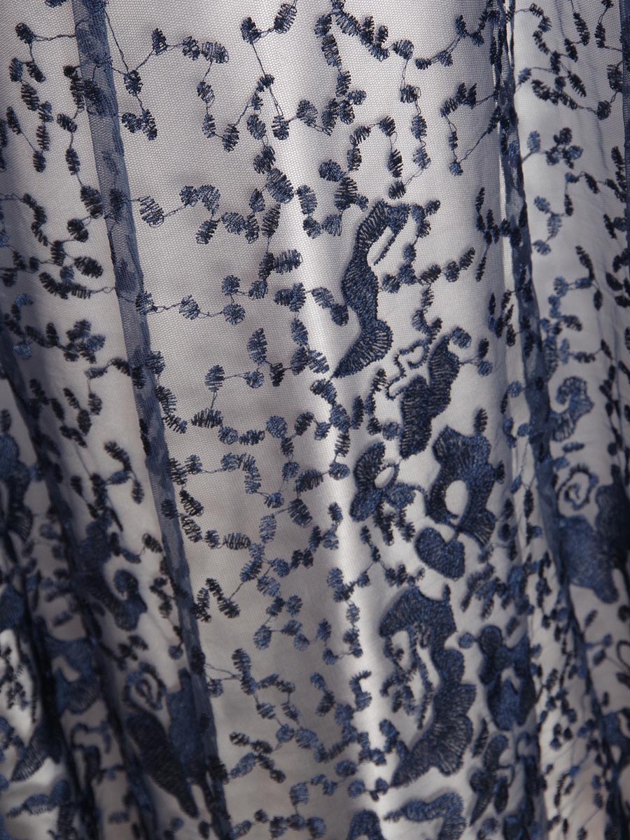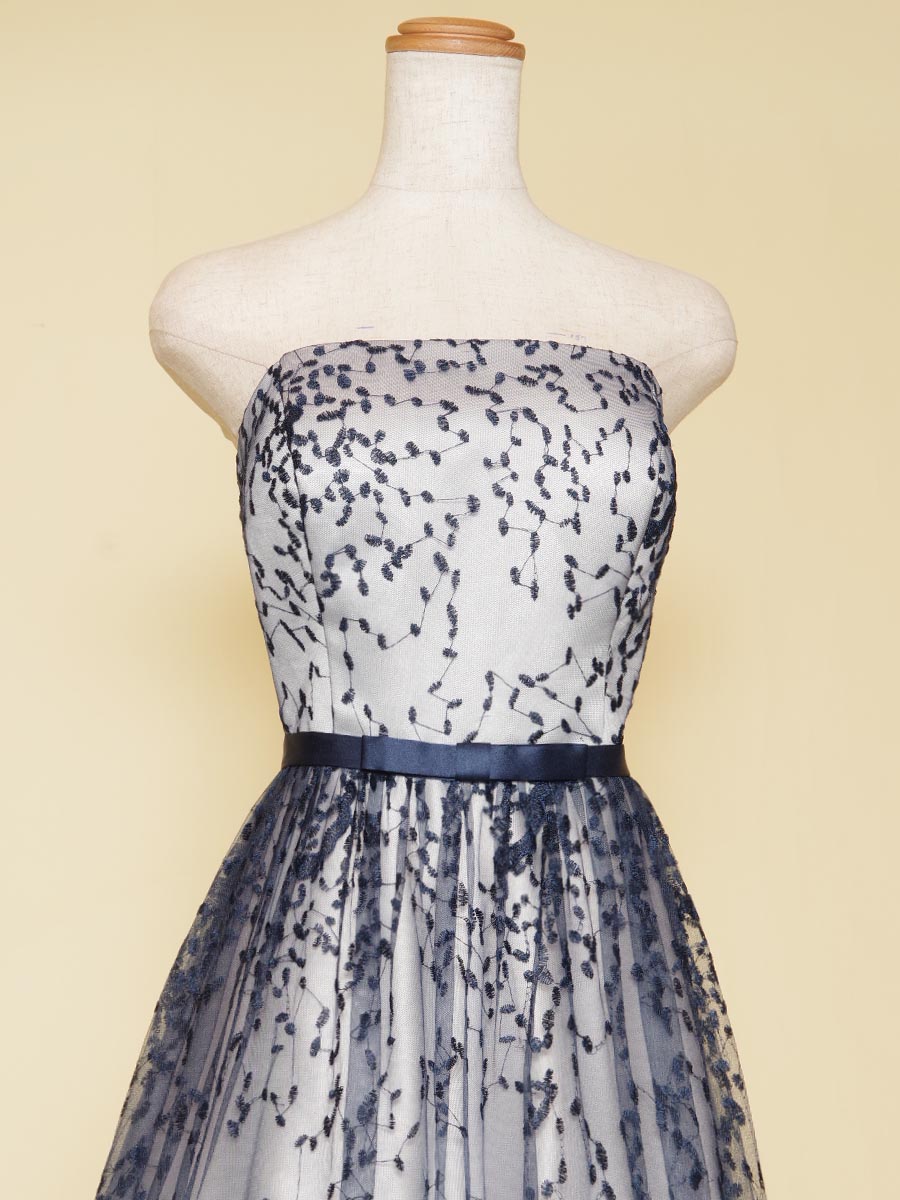 シルバーサテンにネイビーグラデーションデザインのレースを重ねたスレンダーAラインドレス