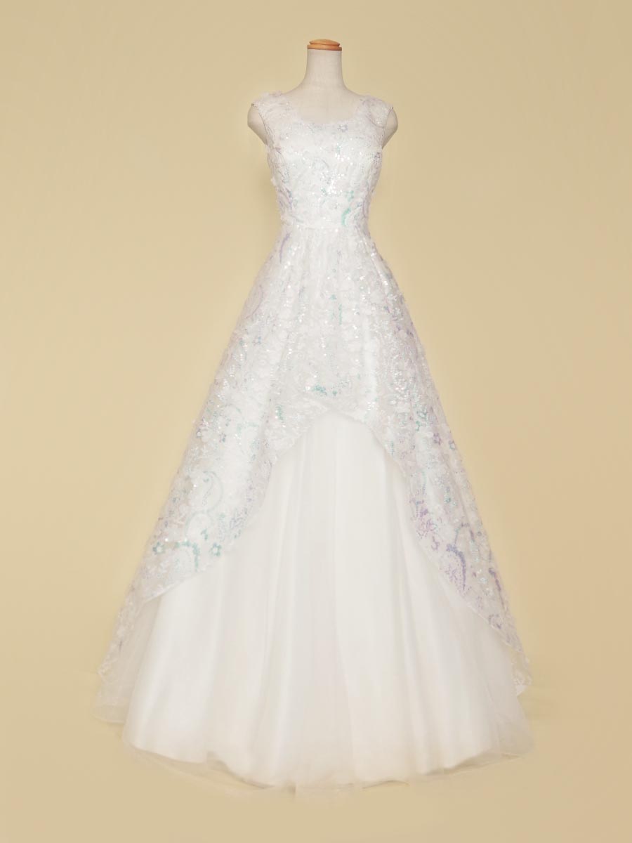 純白のサテンをベースにキラキラのスパンコールレースを重ね合わせた、肩袖デザインのステージドレス。