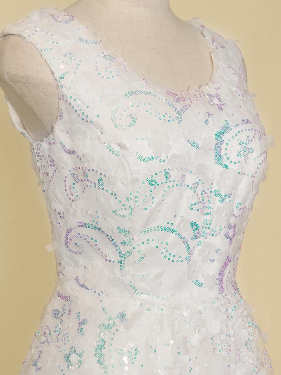 スパンコール装飾が施されたレース生地はデザインドレープ設計で、下地の白サテンが美しく垣間見えるように製作いたしました。