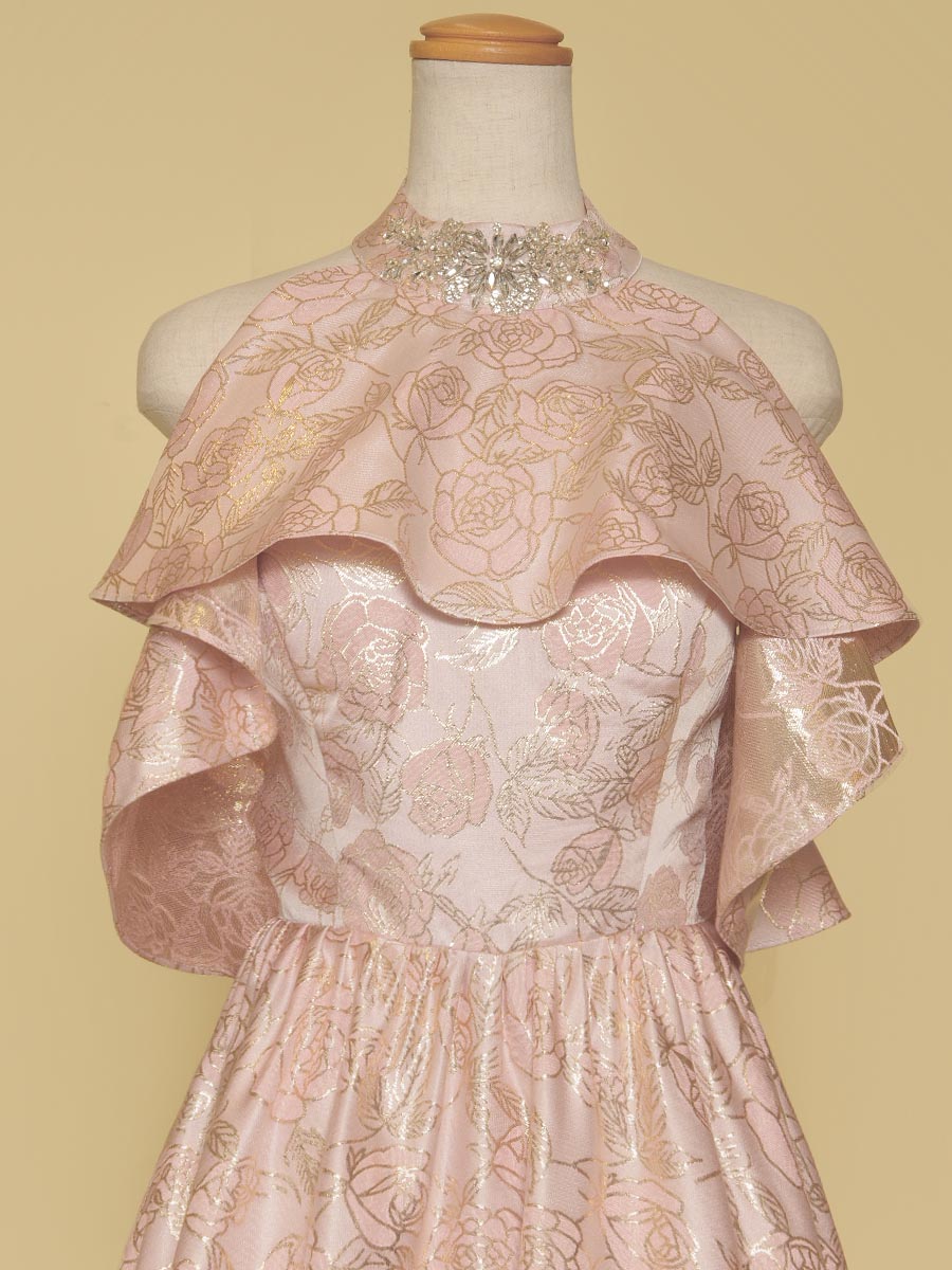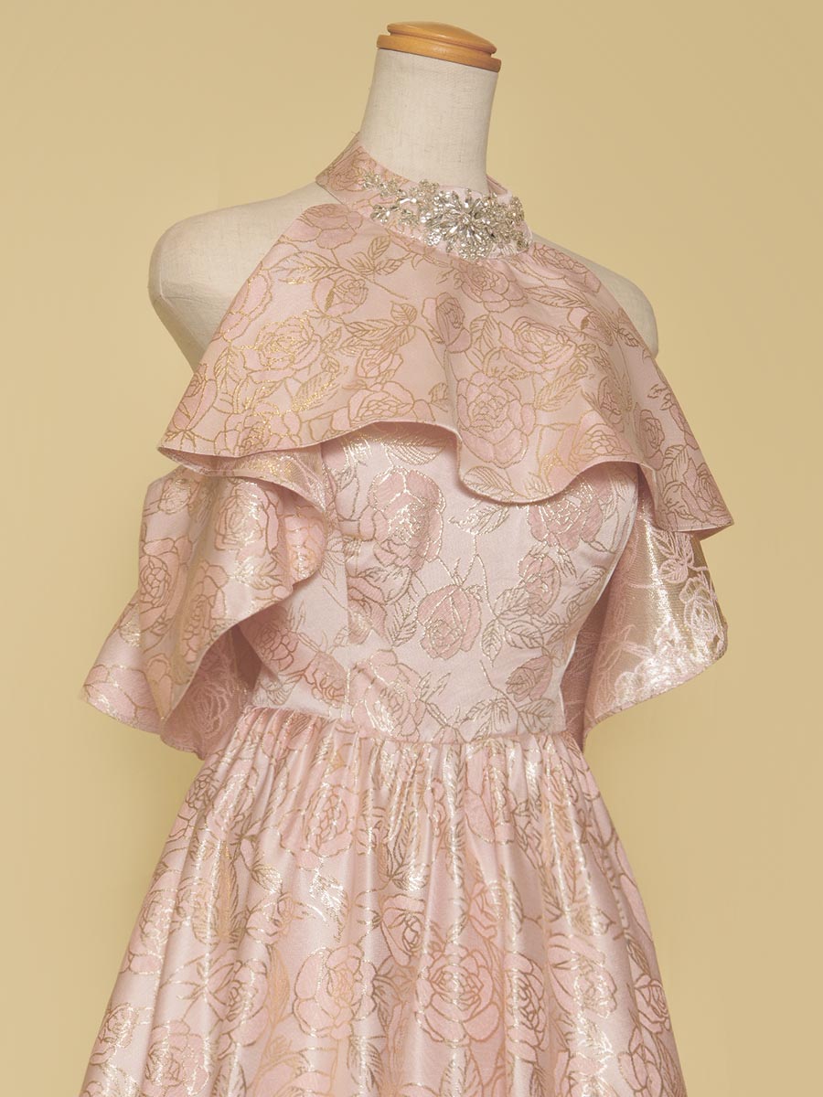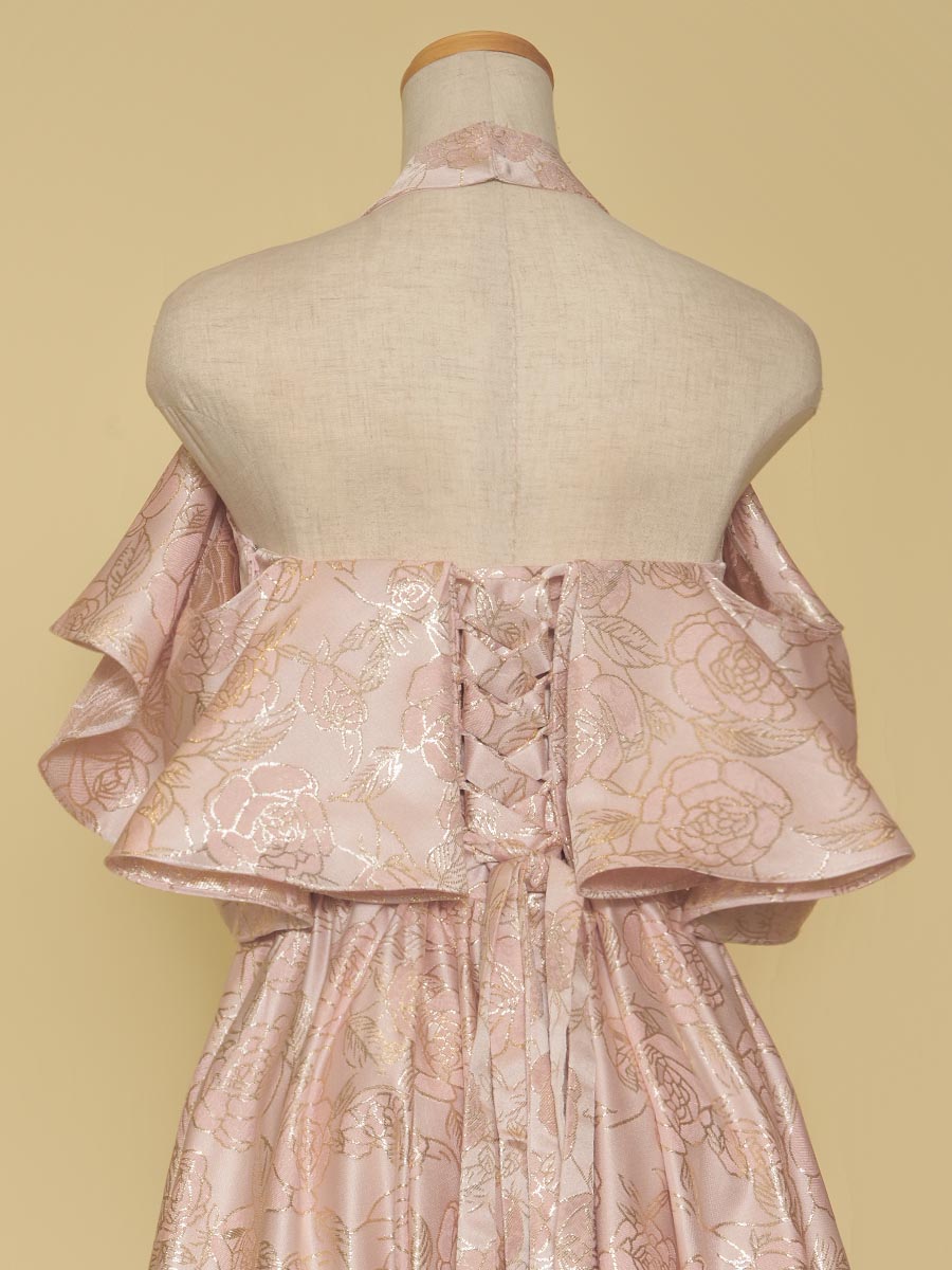 豪華な光沢感を放ってくれるパステルピンクカラーのジャガード生地をドレス全体に贅沢に使用したホルターネックデザイン×オフショルダーのスタイリッシュな演奏会スレンダードレス。