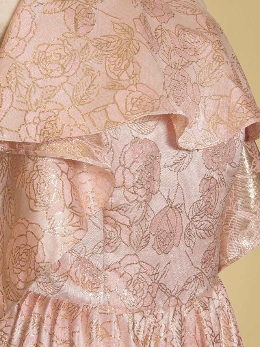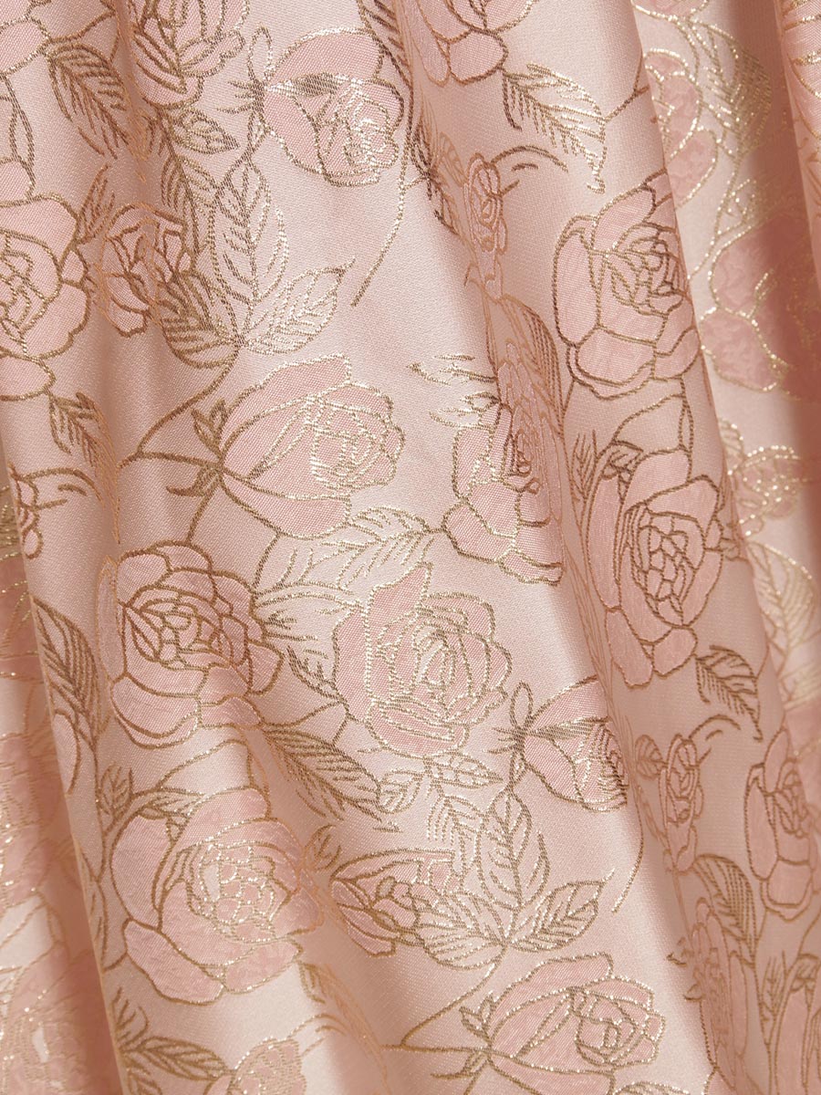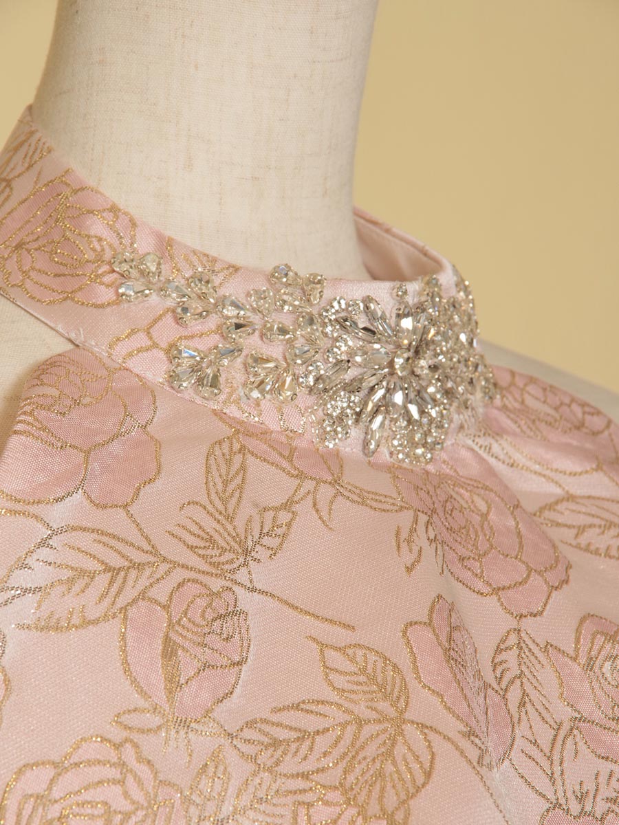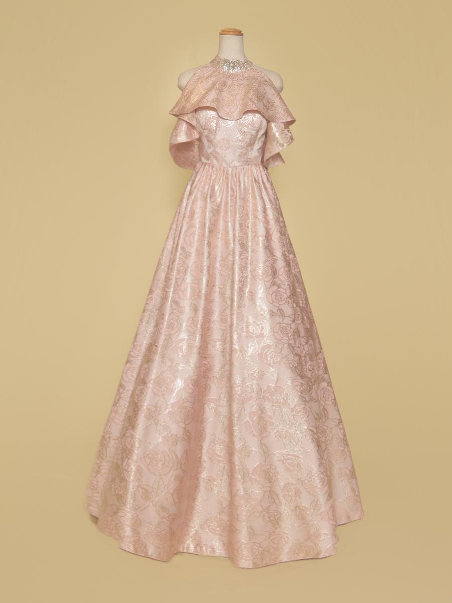 豪華な光沢感を放ってくれるパステルピンクカラーのジャガード生地をドレス全体に贅沢に使用したホルターネックデザイン×オフショルダーのスタイリッシュな演奏会スレンダードレス。