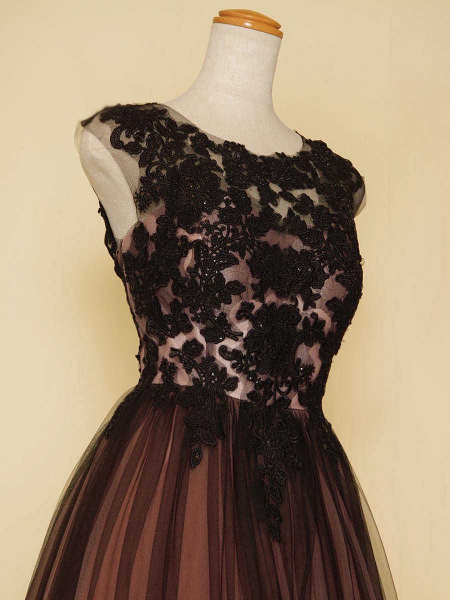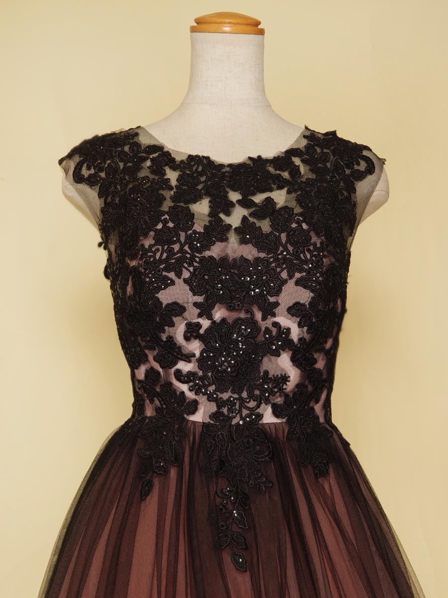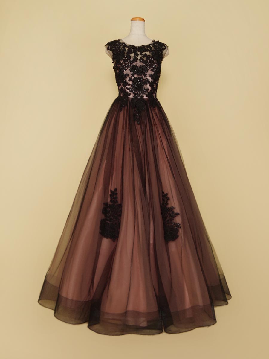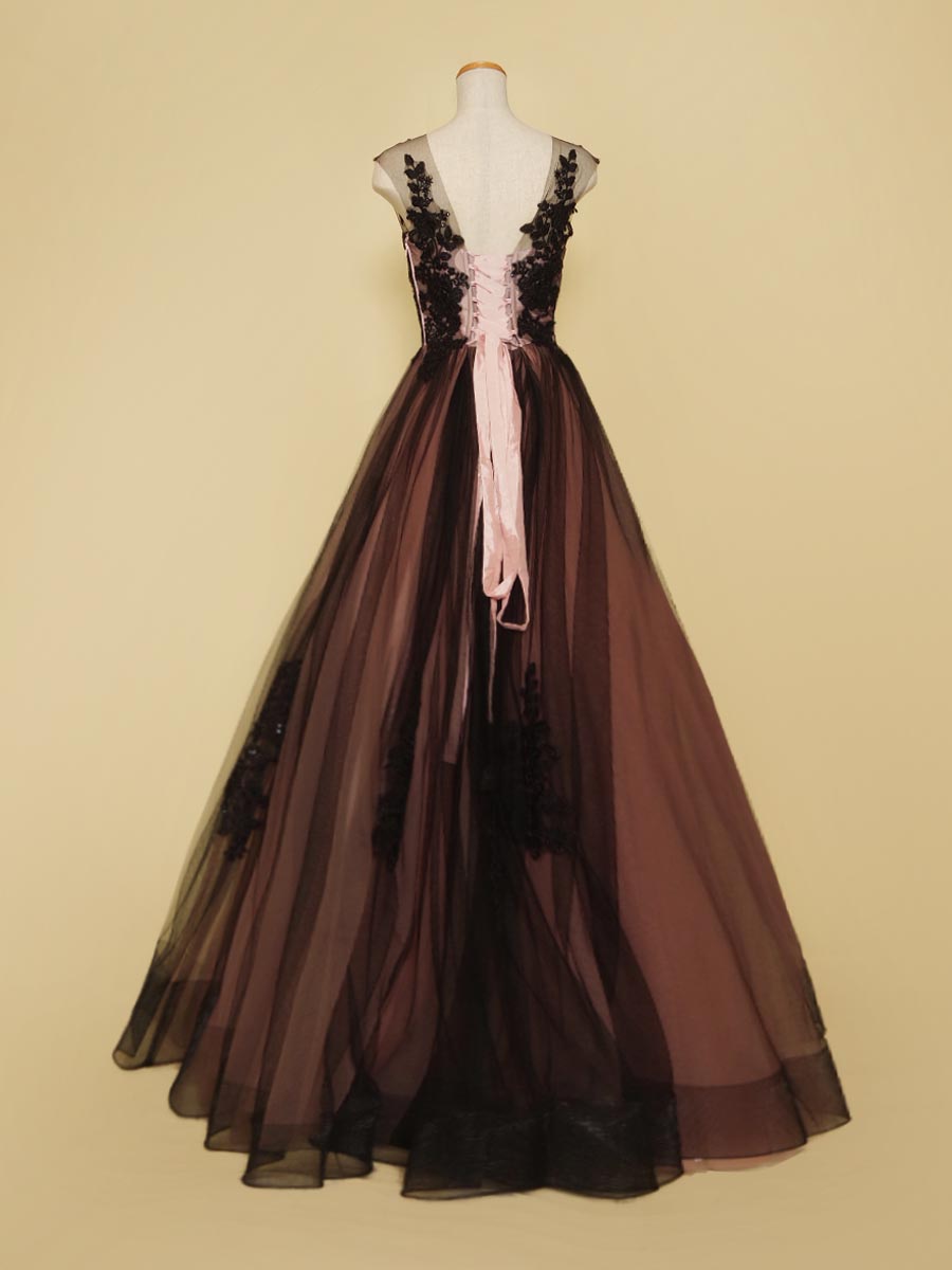 ピンクのサテンチュールを下地にブラックチュールとデザインレースを組み合わせた演奏会ボリュームドレス。