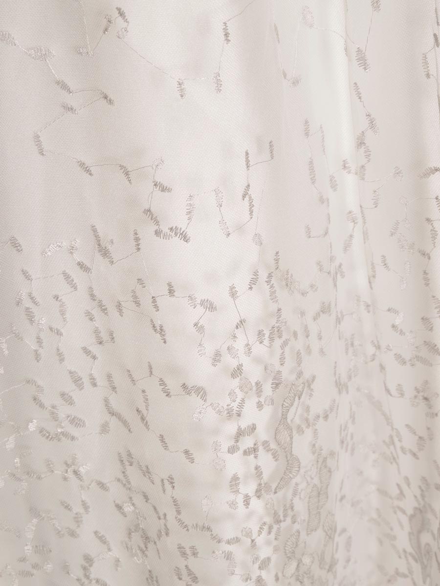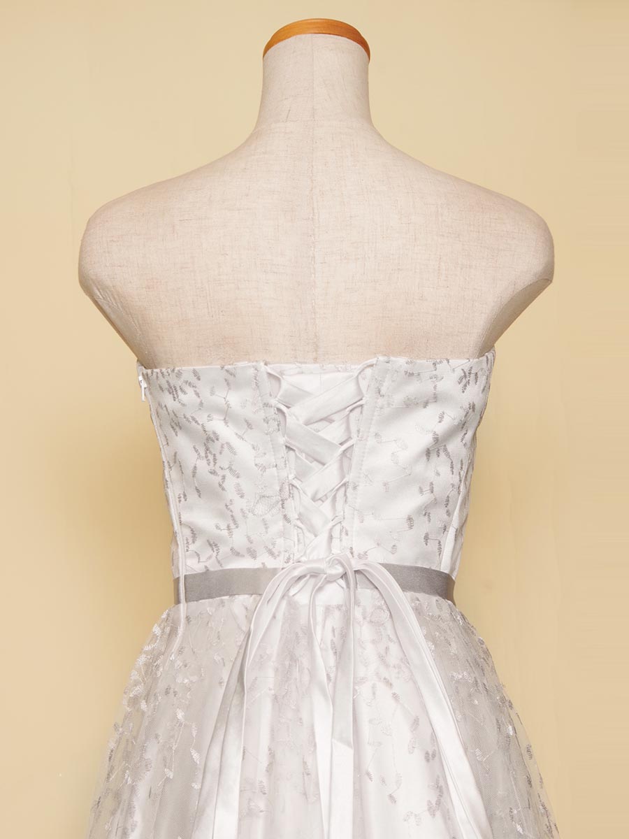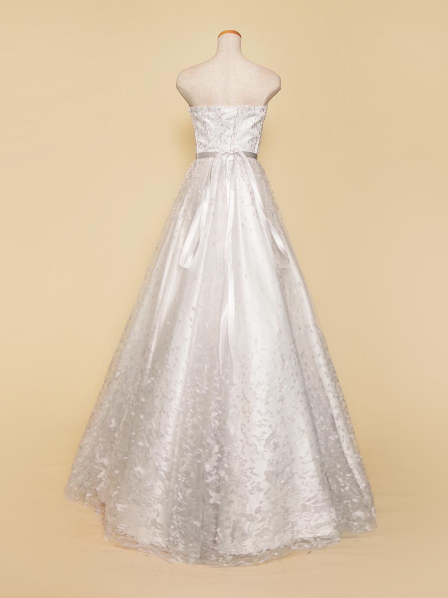 純白のサテン生地をベースにシルバーカラーのグラデーション刺繍を重ねた気品漂う透明感を持った演奏会ドレス。