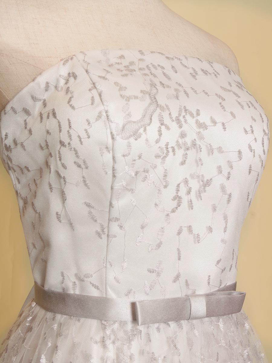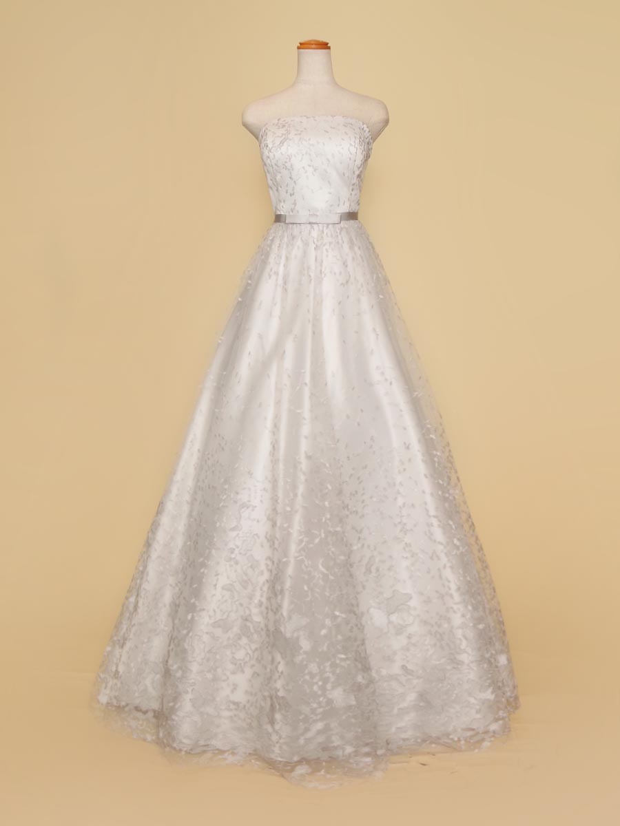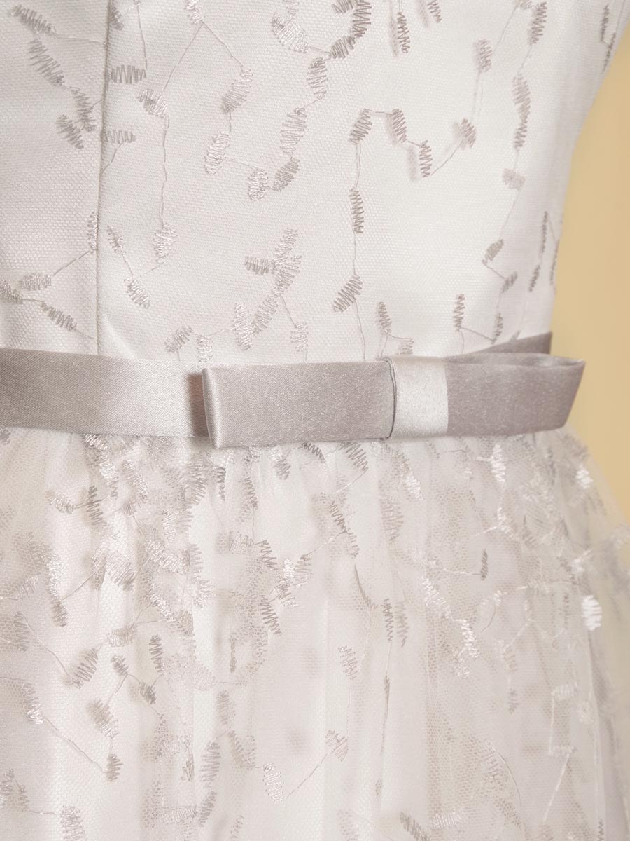 純白のサテン生地をベースにシルバーカラーのグラデーション刺繍を重ねた気品漂う透明感を持った演奏会ドレス。