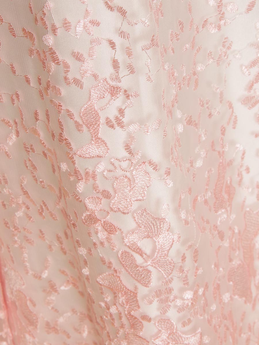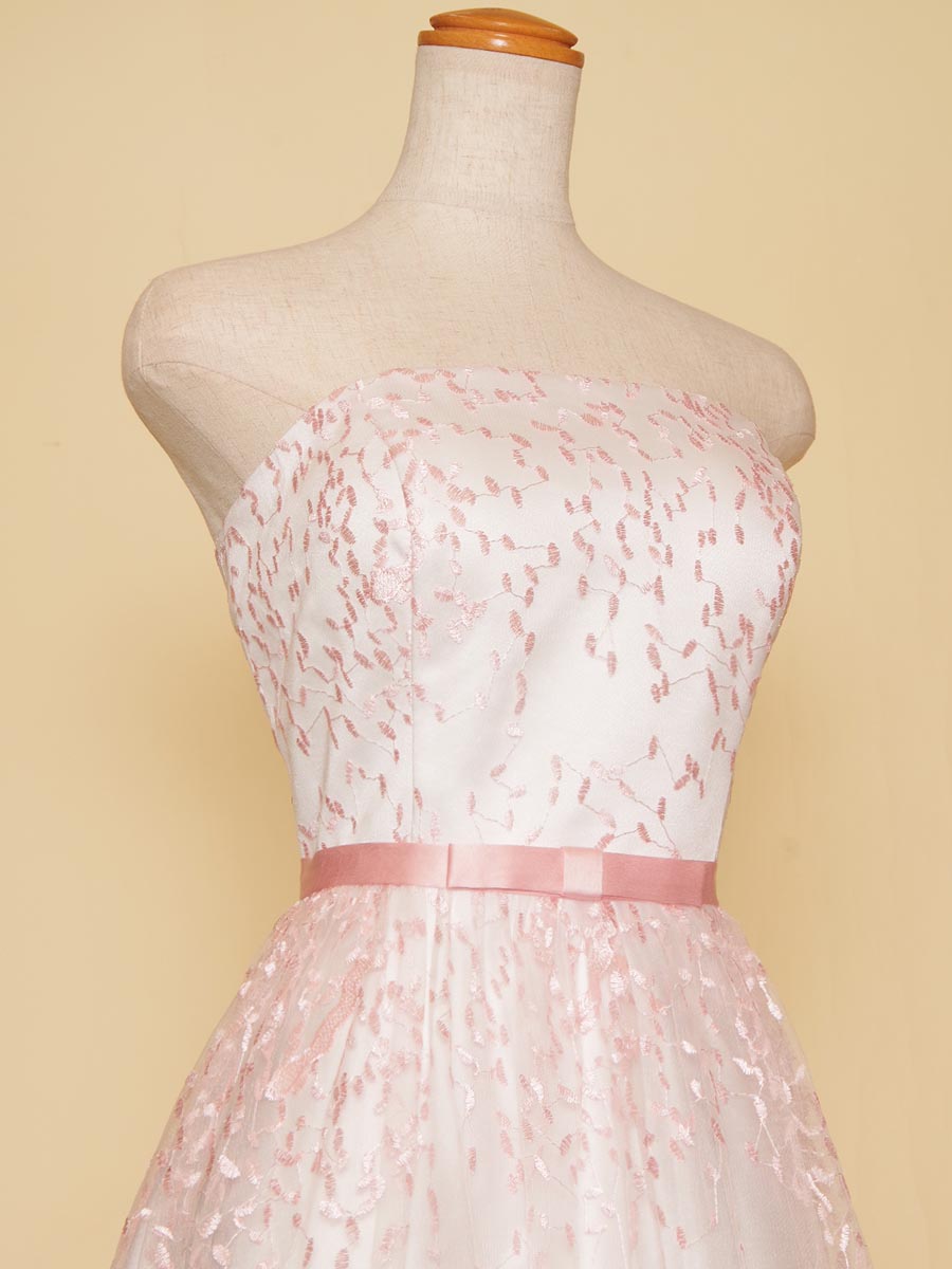 柔らかで優しい色合いのベビーピンクのグラデーション刺繍加工を施したAラインフォルムのステージドレス。