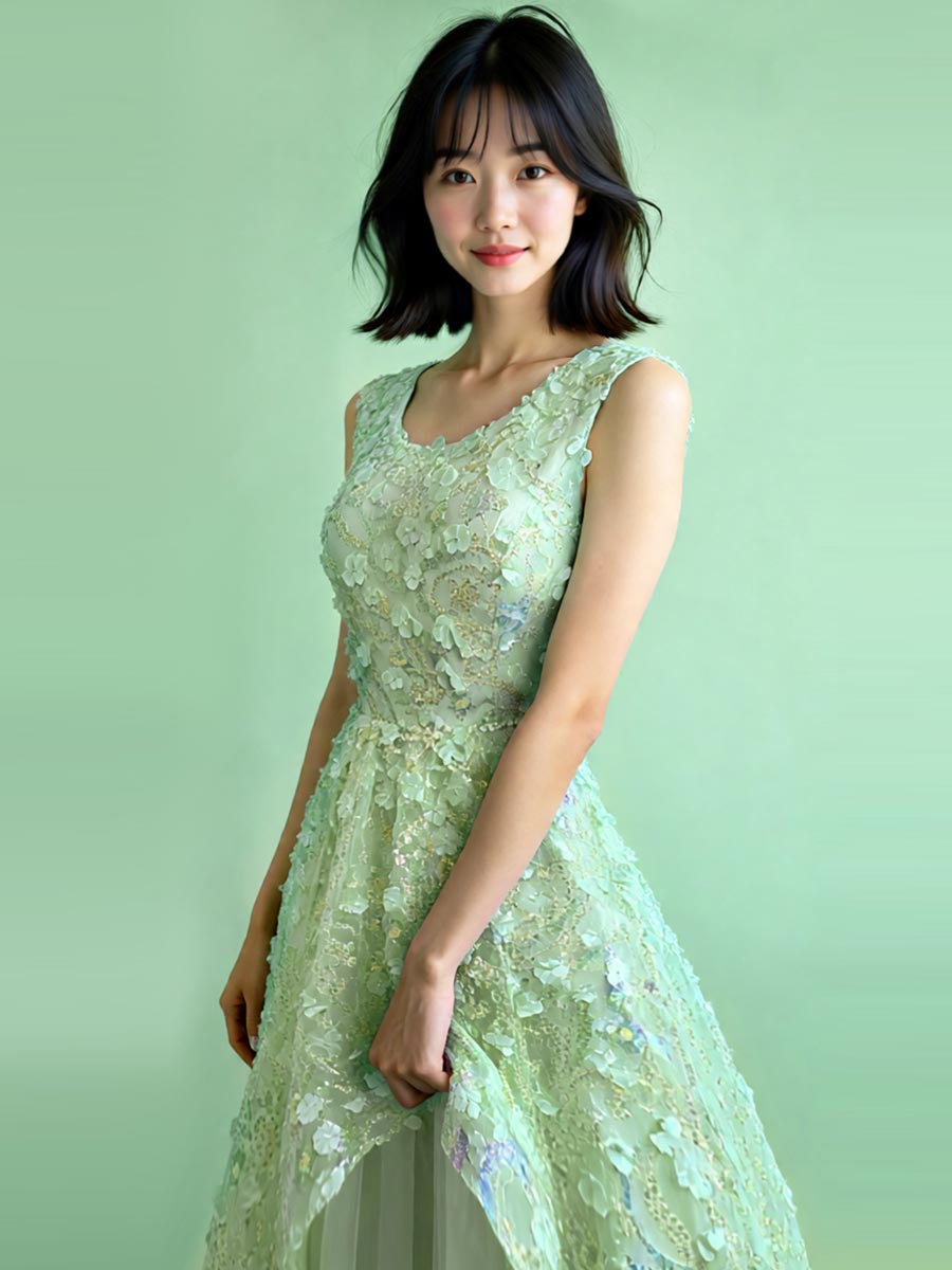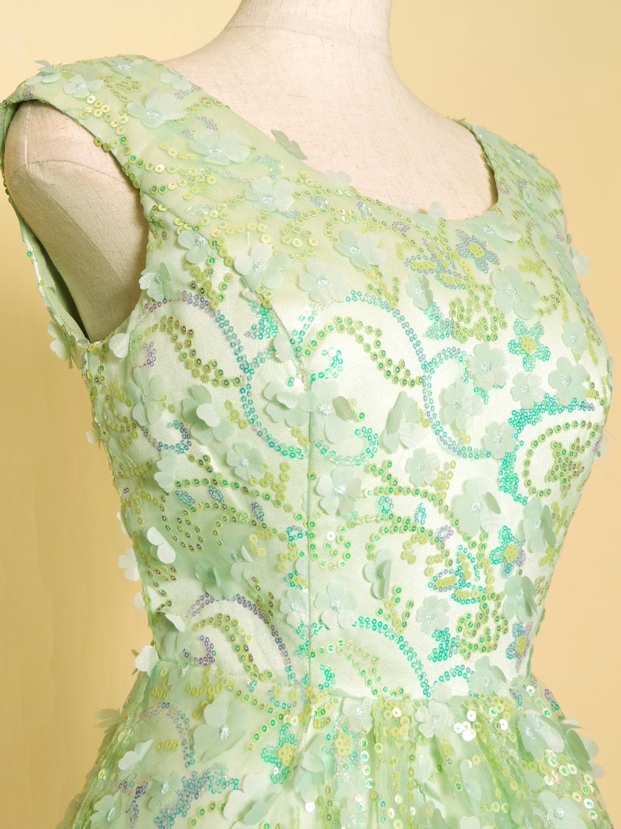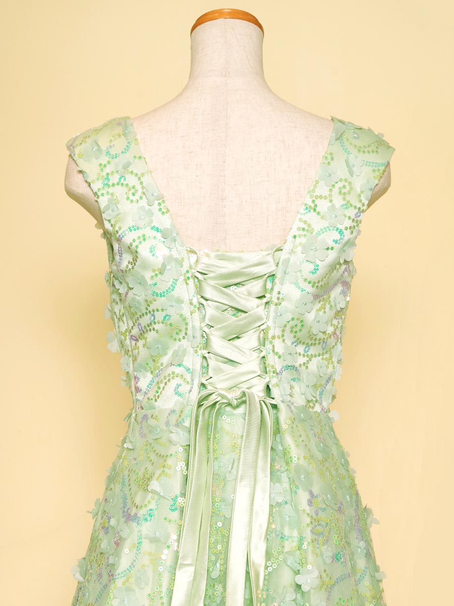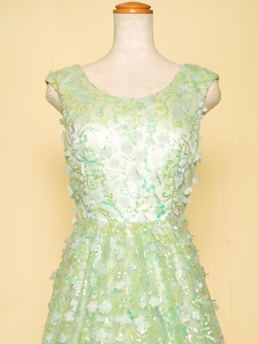 爽やかで可愛らしいミントグリーンカラーのスパンコール装飾がキュートさとゴージャスな印象を演出したステージドレス。