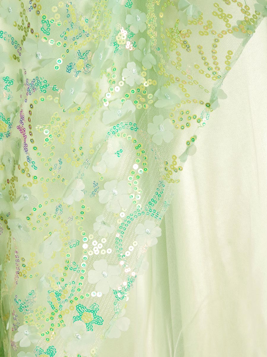 ミントグリーンスパンコールのレイヤースカートがゴージャスな肩袖ステージドレス